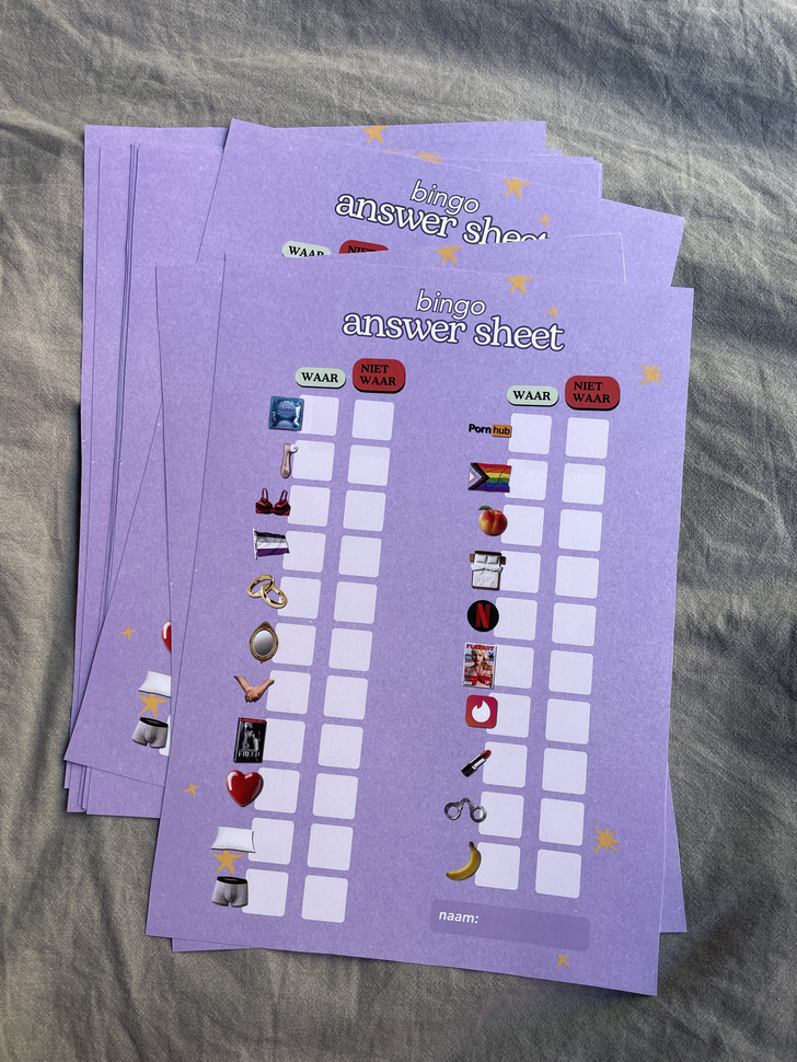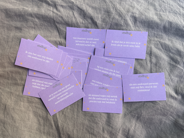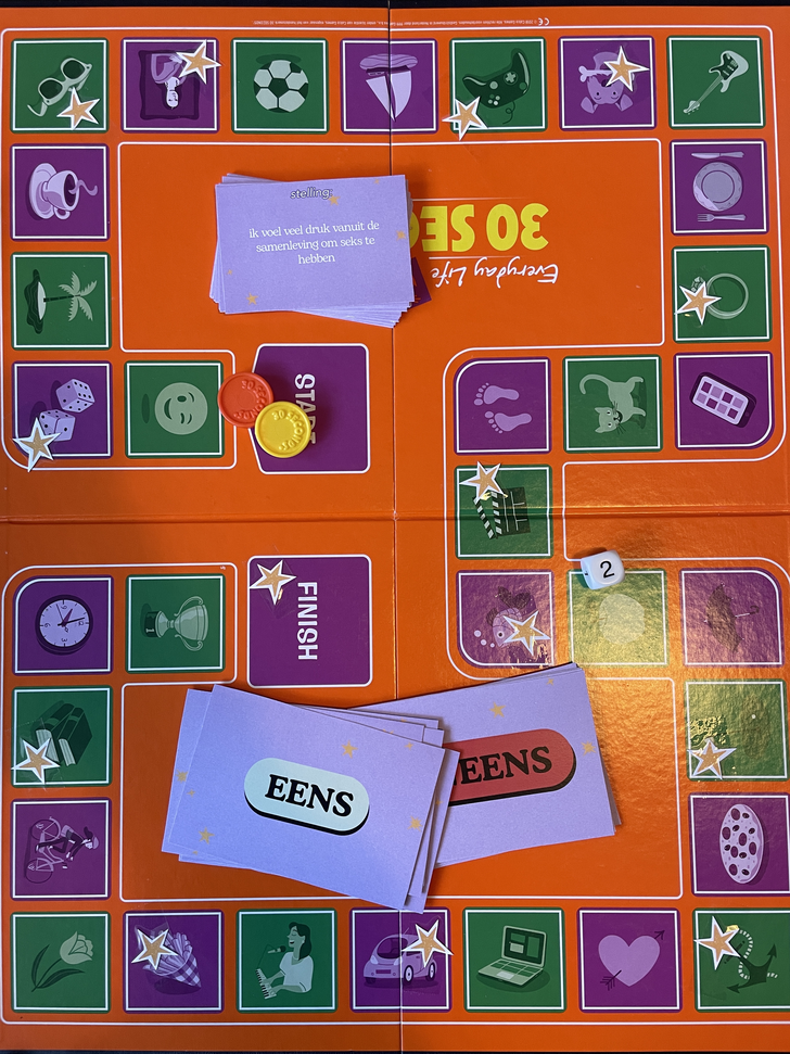 30 seconds een beetje aangepast: wel met de normale woorden kaartjes, maar als je op een vakje komt met een ster trek je een stelling kaartje. De stelling die daar op staat, bespreek je met de hele groep. Om je mening aan te geven, gebruik je de eens oneens kaartjes. Aan de hand daarvan ga je met elkaar in gesprek. De stellingen gaan over (a)seksualiteit.
