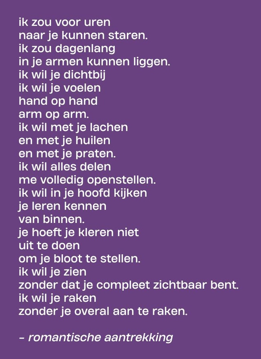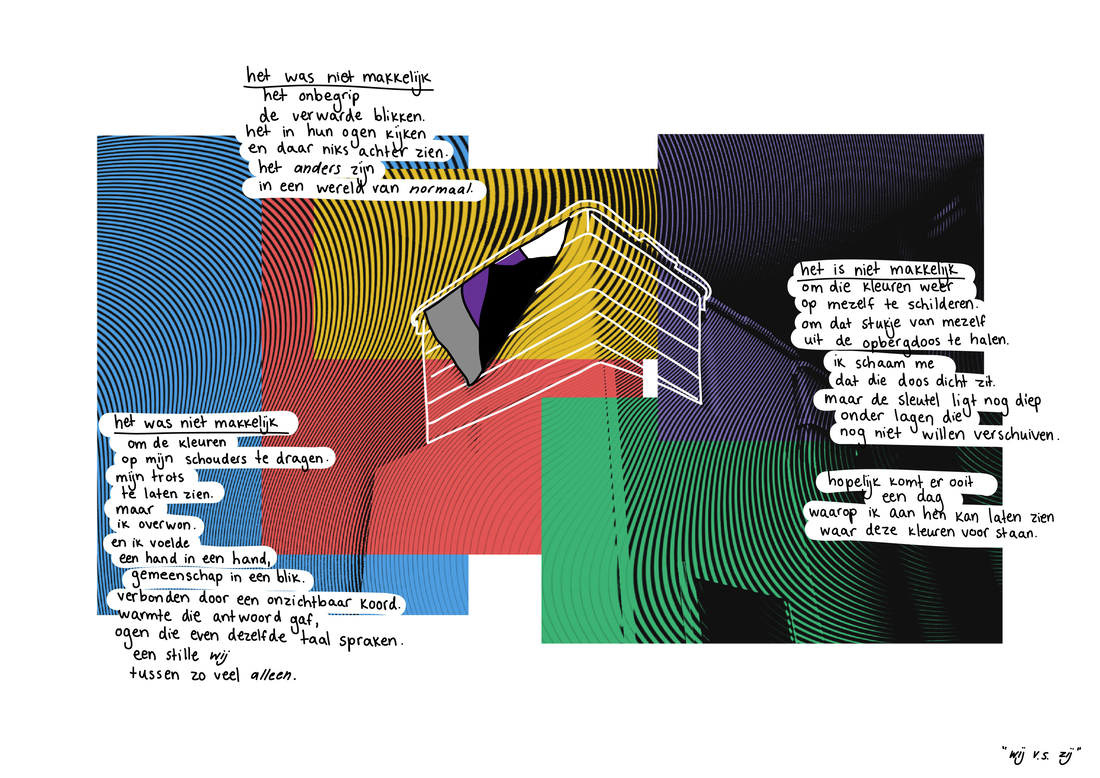 In samenwerking met aseksuele mensen, die mij vertelden over een moment in hun leven die veel voor ze betekent heeft. Daar gaven ze een aantal woorden aan, en stuurden ze een foto bij. Daarmee heb ik gedichten geschreven, en een kunstwerkje gemaakt.