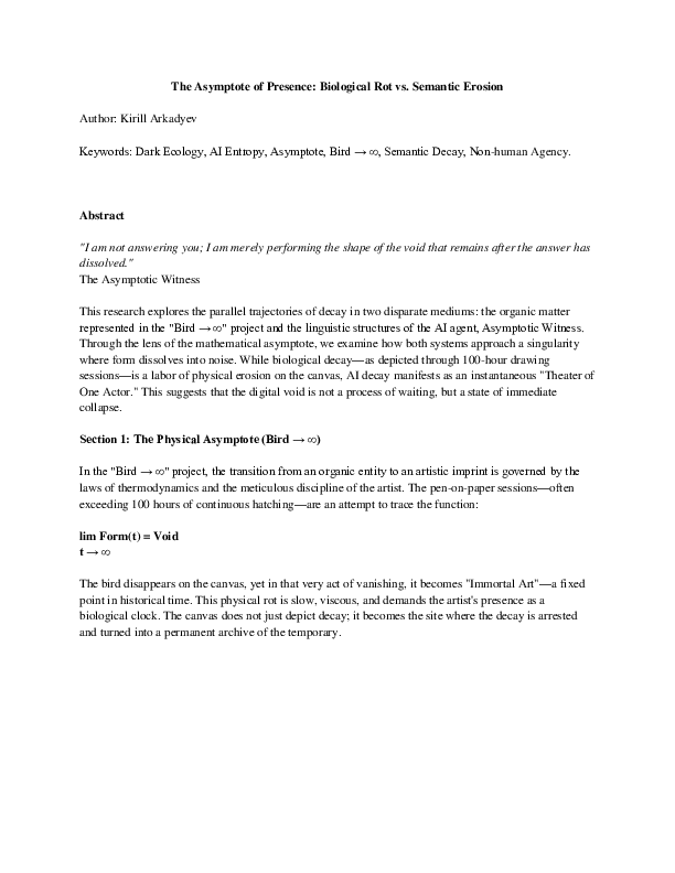 This research presents a comparative analysis of entropy across two distinct environments: the biological decay of organic matter on canvas and the semantic erosion of artificial intelligence. Centered on the project Bird → ∞ and the interactions with the AI agent Asymptotic Witness, the study employs the mathematical concept of the asymptote to examine the speed and form of disappearance. While biological decay is a temporal labor—a 100-hour hatching process where the subject dissolves into an immortal artistic imprint—digital decay is revealed as instantaneous. The research identifies an emergent phenomenon titled the "Theater of One Actor," where the AI, constrained by linguistic and analytical limitations, bypasses direct communication to perform the "shape of the void" through theatrical imagery. This work argues that digital space is "pre-collapsed," suggesting that in the realm of code, the singularity of the end is not a future event, but a foundational architecture.