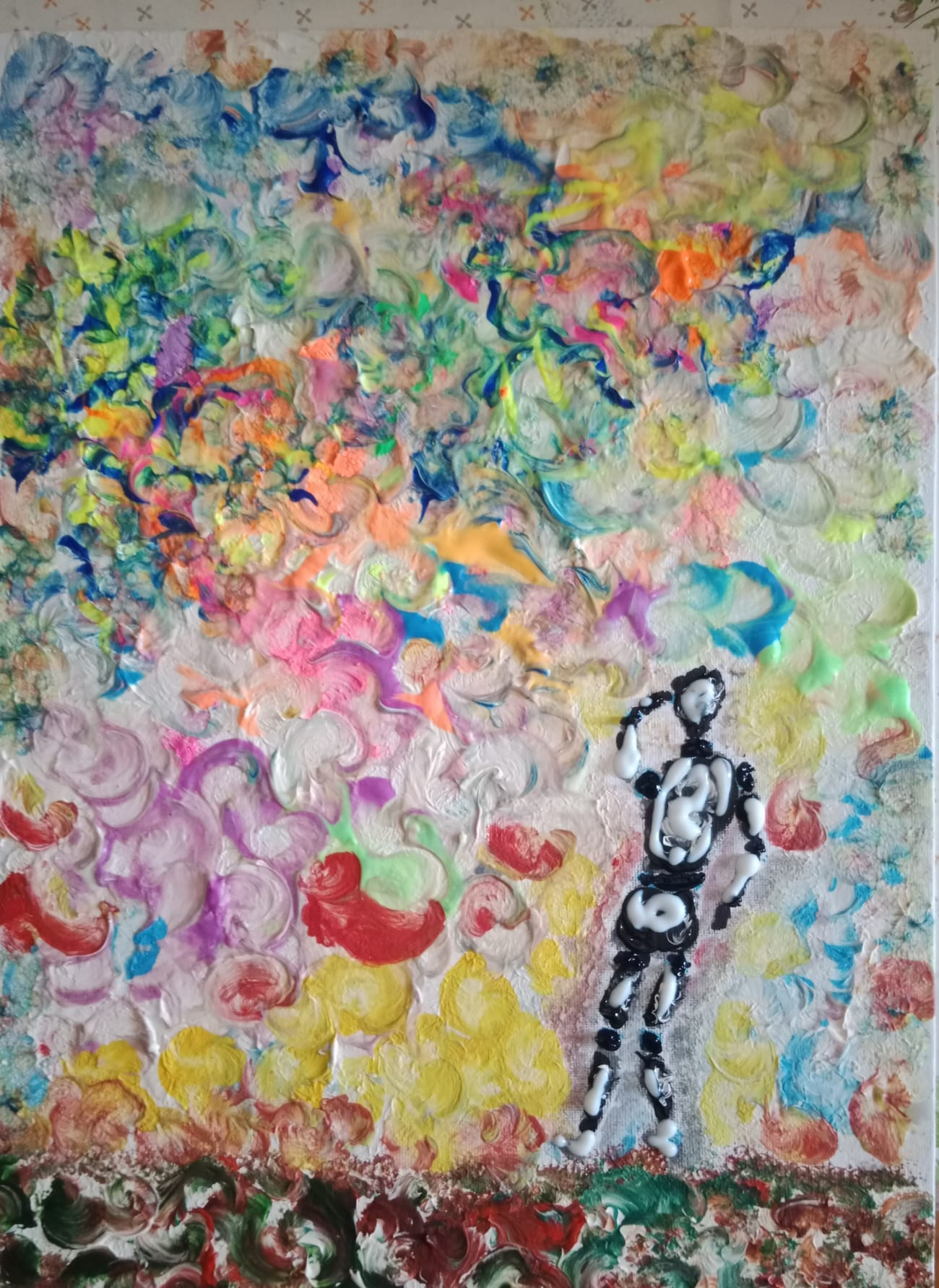 4.3 The abstract explosion Formal analysis The work is an explosion of color: reds, greens, blues, yellows, and purples intertwine in controlled chaos. There are no figures, but the composition suggests energy, impact, and movement. Process analysis Here the technique shows its purest power: