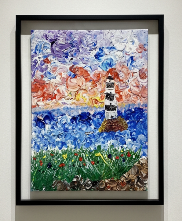 4.5 The lighthouse in the chromatic storm Formal analysis The lighthouse stands out against a stormy seascape, with a dynamic sky composed of purple, blue, pink, and orange. The base is rich in floral and earthy textures. Process analysis