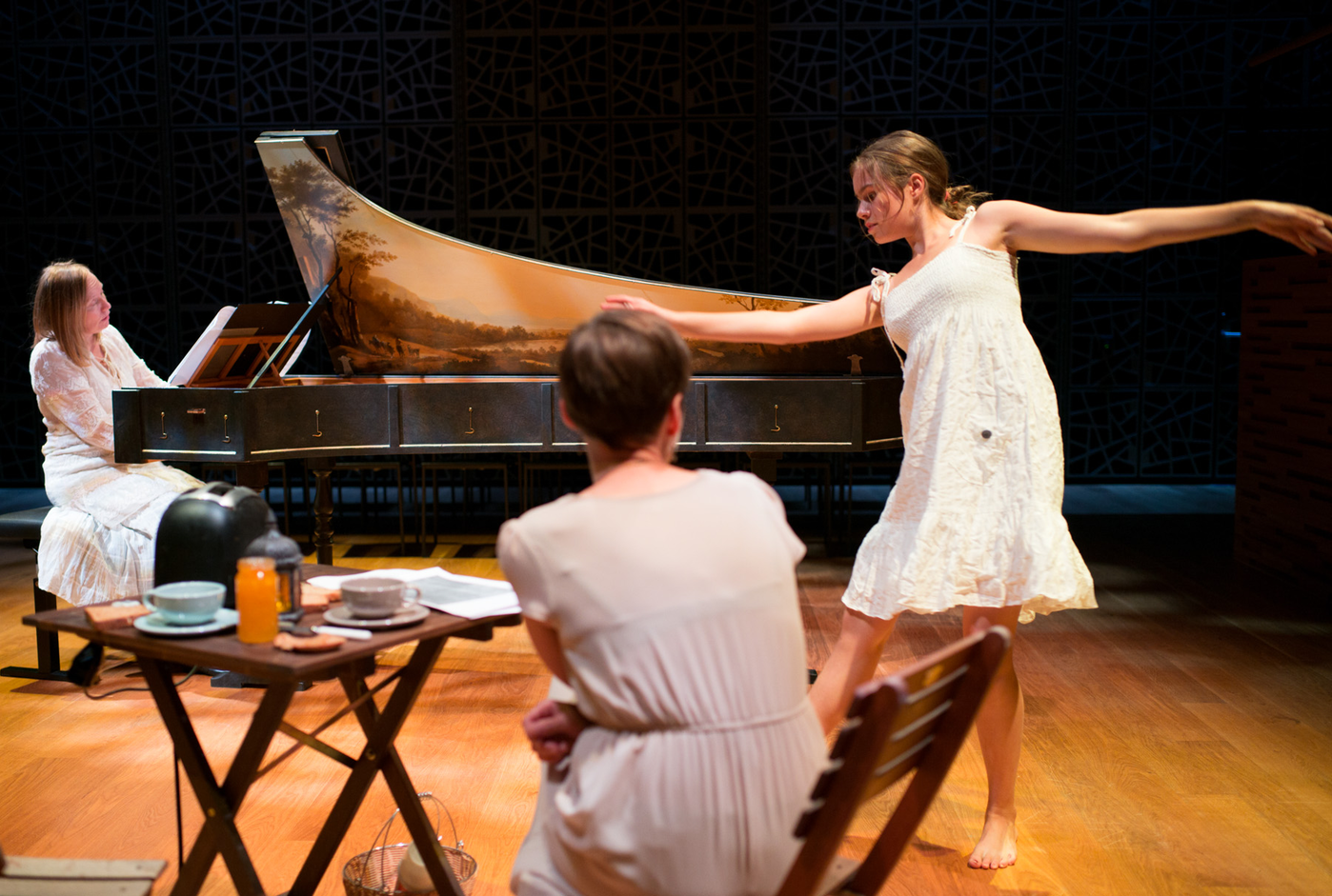 Picture 2. Knif, Jonte: A photograph of Sofia Buono singing, Yoldia van Gemert dancing and Assi Karttunen playing O beau jardin.