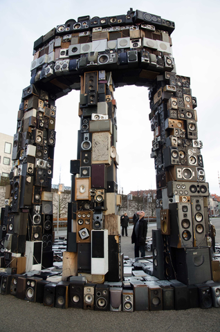 I immediately felt a surge of warm interest in Leitner upon discovering his oft-quoted remark “I can hear with my knee better than with my calves” on Internet. I had spent some time investigating my purchased library “discard” of his book SOUND : SPACE from 1978, so it was with some excitement at meeting his work in “real life” that I approached the area allocated, yet fully exposed to the acoustics of the large exhibition space, for his work, where I reclined on the Ton-Liege, listened inside his StahlFederWellen and explored his Pulsierende Stille.