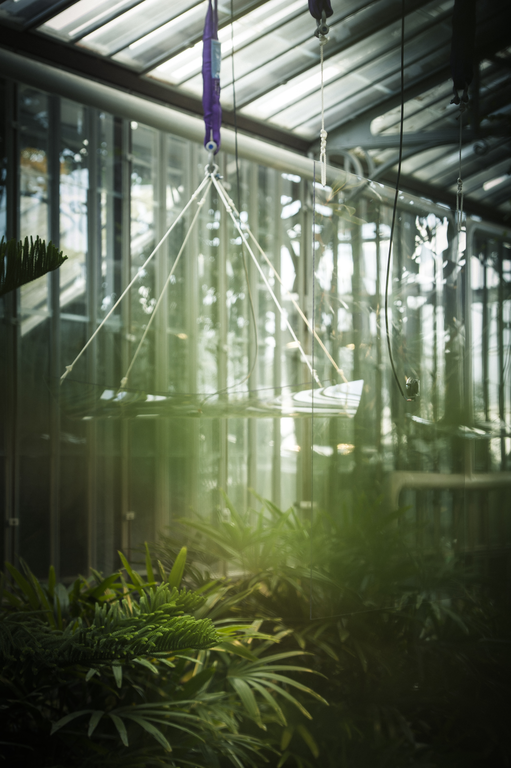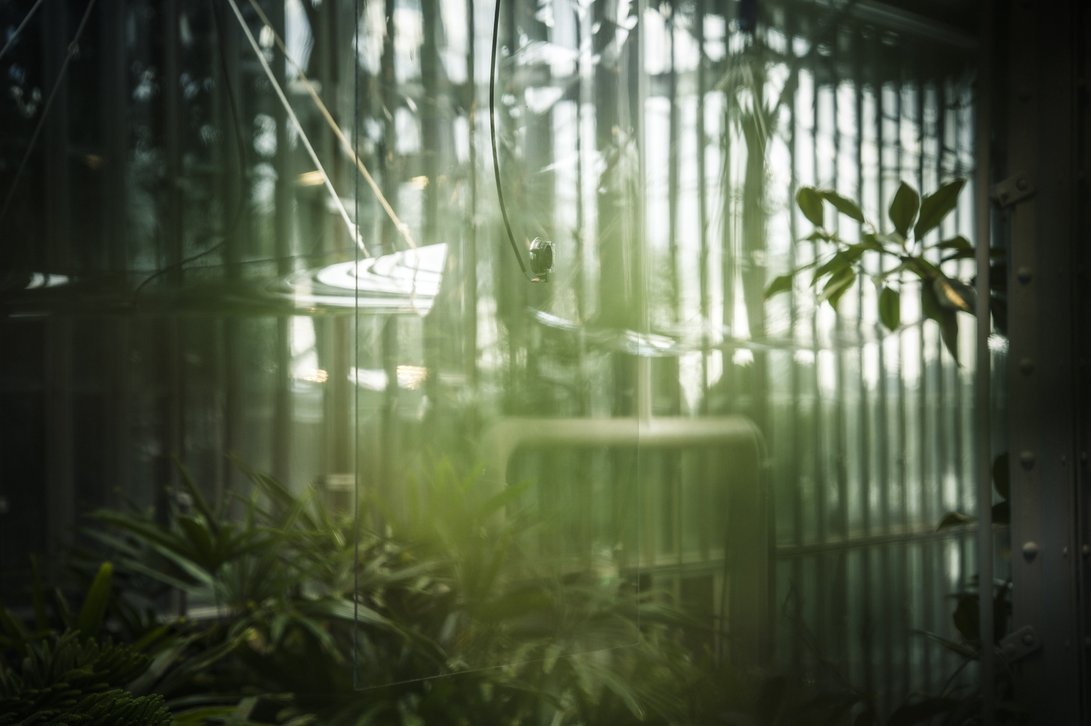 Through different spatialisation strategies, we composed aural zones of experience that rewarded audience agency as they explored the audio-architectural installation. In addition to the sound-emitting objects responsible for the final weather-like sonic situation, an array of passive sonic objects also reverberated and distributed sonic content in all sorts of directions. These passive sonic objects were largely the glass structure, walls, and plexiglass panels. These elements’ behaviours were, to a certain extent, easy to intuit and design accordingly; but there were plenty of other passive sonic objects, like the furniture, the fishpond, and above all, the plants. The complexity of the sonic situation necessitated a working process of trial and error, intuitively mixing sonic materials and doing most of the compositional work on site.