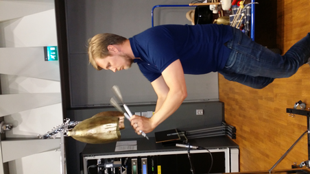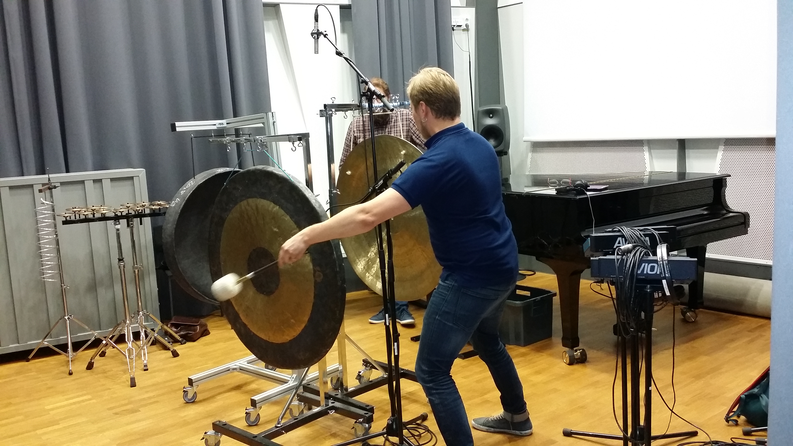 Based on this intuition, a large amount of initial sound material was then recorded with the percussionist Petteri Kippo at the studios of University of the Arts’ Sibelius Academy. The Sibelius Academy’s percussion collection was used, concentrating on metal, glass, and ceramic instruments. A total of three hours' of sound material was recorded. The above photos depict Petteri Kippo in the recording studio. Close mic’ing techniques were used in order to ‘zoom’ into the sound and retrieve as much detail as possible. The Talvipuutarha greenhouse acoustics are very reverberant and may cause a loss of detail in sound. It was thus very important for us to have high precision sound material to start with.