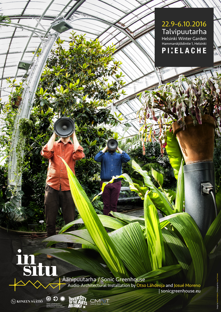 IN SITU: Sonic Greenhouse is a large-scale audio-architectural installation that took place in September and October 2016 at the historic Winter Garden Greenhouse in Helsinki, Finland, and was experienced by approximately six thousand visitors. The piece transformed the entire glass structure of the greenhouse into a multichannel sound object or a macro-scale musical instrument.