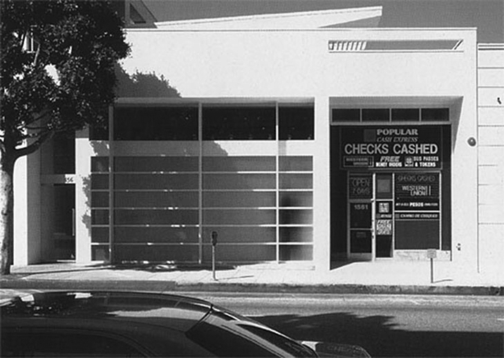 Glen Seator created doubled architecture some years before Schneider, three projects in particular: “Approach” (1996-97) and “Within the line of the studs” (1997) which replicated the façade of the building in which each installation was built, and “Fifteen Sixty-One” (1999) which replicated an east Los Angeles cheque cashing service into the Gagosian gallery in Beverly Hills. Similarly to Schneider, the method of construction and the materials for the construction have to be identical across the ‘original’ and replication in Seator’s work. This is evidenced in "Approach", where Seator replicated the street, sidewalk, and facade of Capp Street Project within its gallery space. Every detail was replicated, down to the graffiti on the telephone poles and the differences in the aggregate used in the concrete paving. Seator's work offers a kind of stuttering architecture, a replication in such detail as to repeat the material reality of the original.