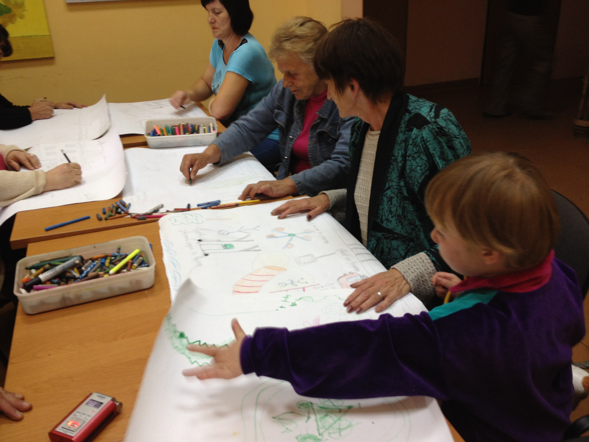 In the workshop in the Bobrek Activity Centre MOPR in August 14 the participants were middle-aged women, which were active members of the community and teenage girls and primary school children. I asked the participants to focus on their everyday life and asked them to draw their experiences as drawings, maps or diagrams. The topic of the workshop was the transformation that had taken place in Bytom in the past twenty years. What was the effect of this transformation on the social, mental, physical, economic and environmental life, from their subjective perspective? I instructed them to pay attention to different parts of their everyday life and to use different colours, texts, symbols, lines, images or patterns to define them. These parts were the following: the places of importance, functional places, rules, laws, regulations, obstructions, emotions, attachment to people, plants, animals, memories, thoughts, ideas, critique and ideologies. After all these aspects were drawn I asked them to make connections between the items, and asked how their life is connected with the larger context of Bytom, Poland or Europe? In the end I interviewed each one of the participants and asked them to describe the drawing they had just made.