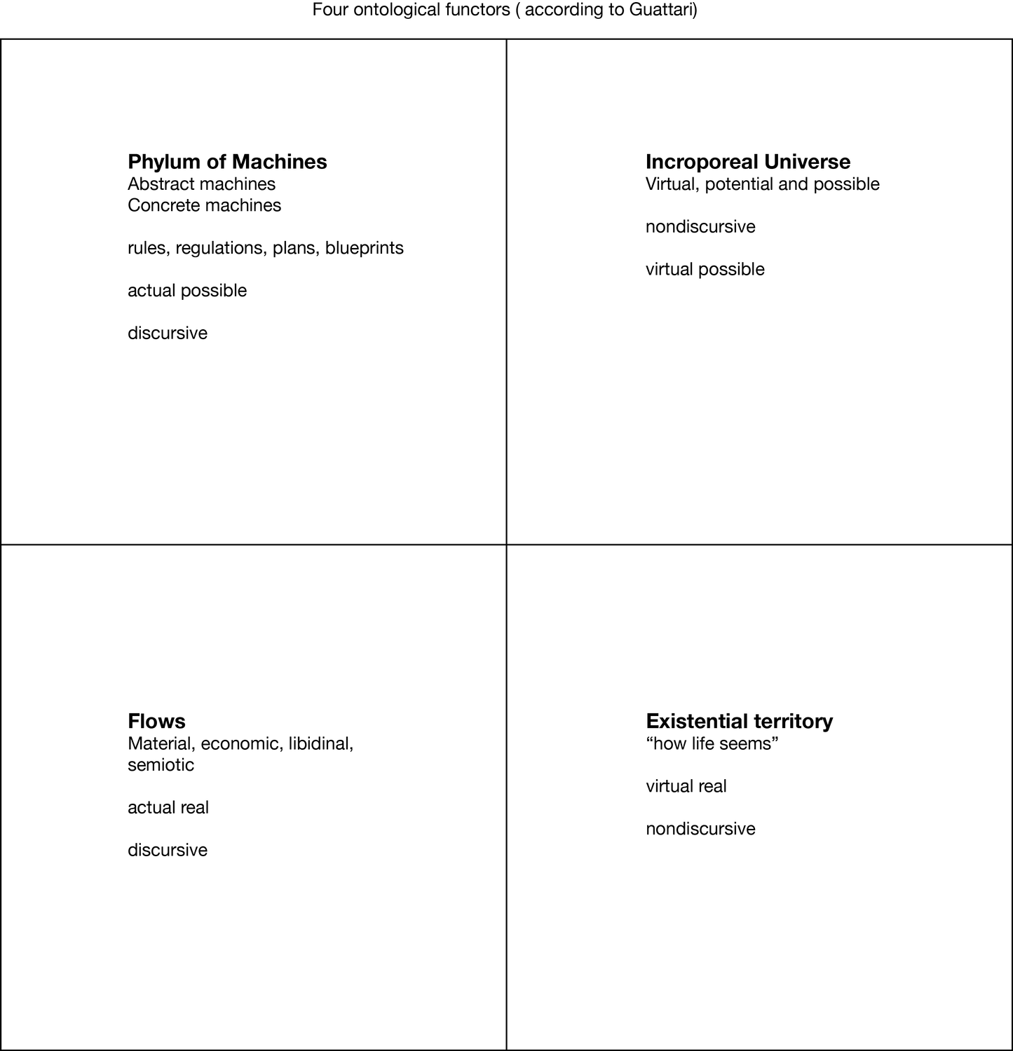 The question of non-discursive matter is essential, aside from the discursive signification. In addition to the horizontal division between real and potential, Guattari’s map is divided vertically, where it responds to the division between objective and subjective; the left side deals with the ‘given’ while the right side is the domain of the ‘logic of body without organs’. (Watson 2009, 125) Artistic processes dealing only with semiotic significations, deal with power and language and consequently produce more signification. In turn, artistic practice cannot reside only in the domain of potential Territories and Universes, since it requires machines, in other words significations of the material flows in the real. In order to produce changes and transformations both in the singular, existential territory or ‘how life seems’ and between the organizing power of machines and material fluxes practice should consider both signification and a-signified potentials – the consistency of the singularization processes.