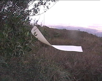 “I spent only about three weeks on Mount Randa trying to write the second act of the radio play I had started in Farrera and video recording a small work inspired by the constant wind (slices of paper with a sign by the road side moving in the wind – never edited). I video recorded the material for Wind Rail as a by-product, a private souvenir. My room was at the end of a terrace facing southwest. The view from the mountaintop was breath-taking, the sunsets were glorious, and the changing weather conditions - clouds, mist, and sun, always windy - were amazing. Dominating were the sky and the wind. I was fascinated by the fact that the wind was not visible without something moved by it, so I used myself as the moving element and video recorded me with a black scarf looking at the view.” (Arlander 2003a)