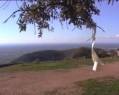 “I spent only about three weeks on Mount Randa trying to write the second act of the radio play I had started in Farrera and video recording a small work inspired by the constant wind (slices of paper with a sign by the road side moving in the wind – never edited). I video recorded the material for Wind Rail as a by-product, a private souvenir. My room was at the end of a terrace facing southwest. The view from the mountaintop was breath-taking, the sunsets were glorious, and the changing weather conditions - clouds, mist, and sun, always windy - were amazing. Dominating were the sky and the wind. I was fascinated by the fact that the wind was not visible without something moved by it, so I used myself as the moving element and video recorded me with a black scarf looking at the view.” (Arlander 2003a)