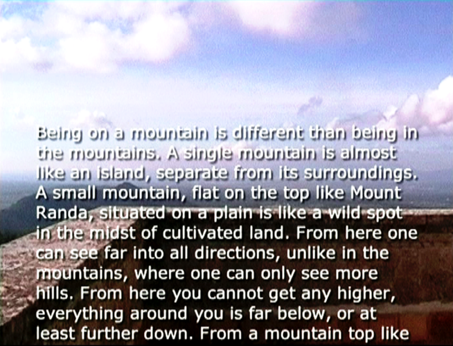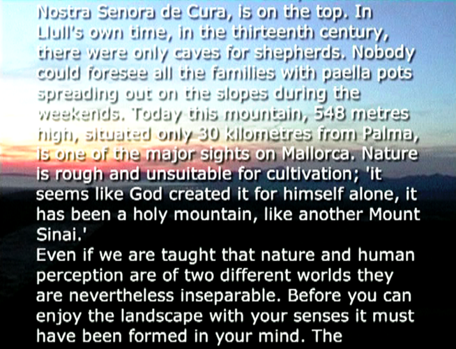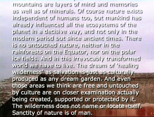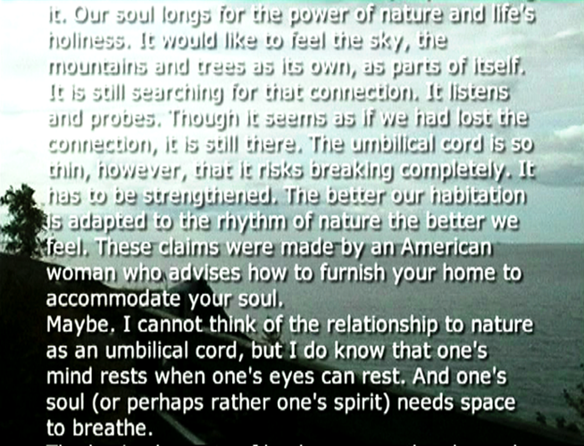 Kun päätin lisätä "tyhjän" maisemakuvan päälle englanninkielisen tekstityksen suomenkielisestä kertojan tekstistä ajatus kuulokkeista ei toiminut lainkaan. Päädyin siihen, että installaation voi esittää joko kahtena rinnakkaisena projisointina, tai kahdesta vierekkäisestä monitorista - kunhan ne on synkronoitu.