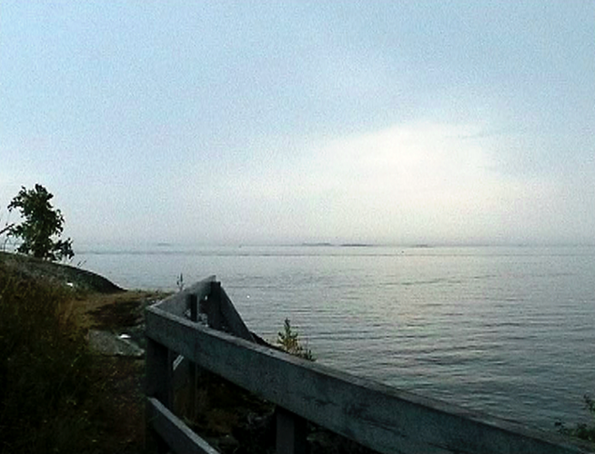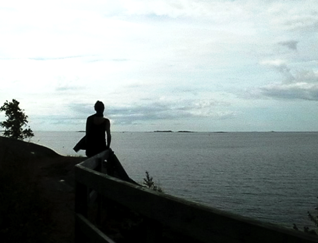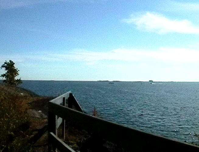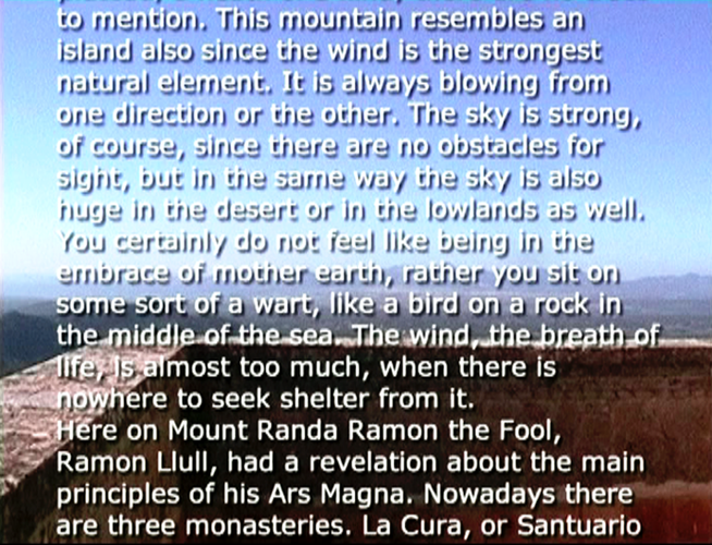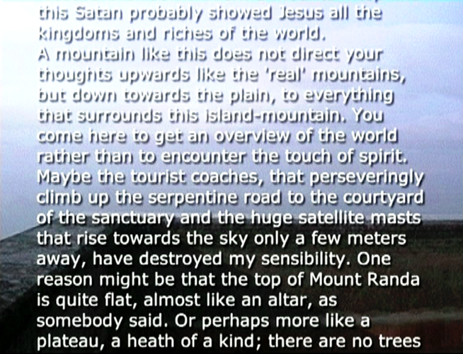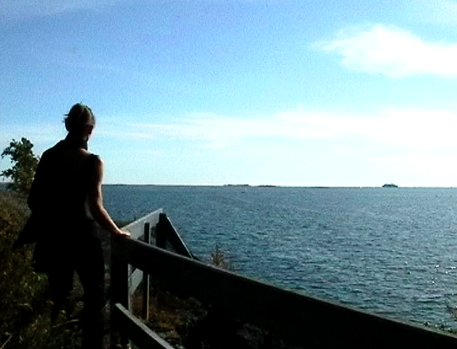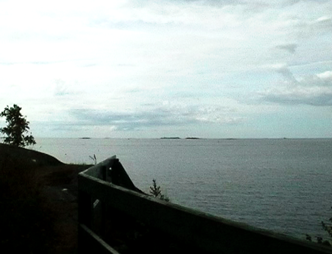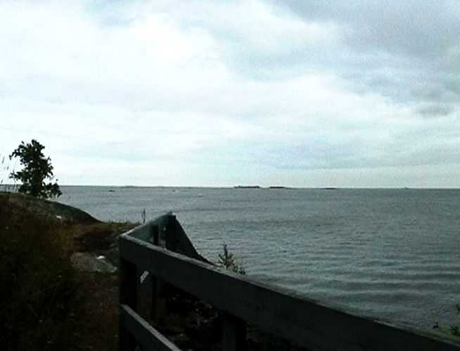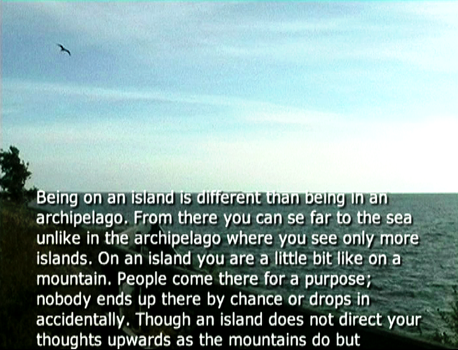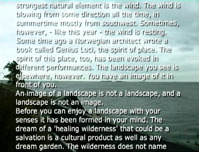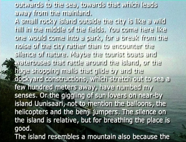 Wind Rail II was presented as an installation on four small horizontally placed monitors in the exhibition Year of the Horse on Harakka in the Telegraph of Harakka in summer 2003. The line of the horizon formed of four horizons appeared almost by accident. Each monitor had headphones and three of them had different sound (voice-over text, sounds of the landscape, music). The work has not been shown elsewhere, but I imagine it could work as projections placed in line, too. In that case the question of the sound would have to be rethought.