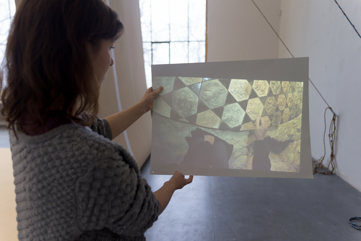 Then I asked them to try to remember how was it at that time and if they could show me how they did it. Afterwards, we came to a pantomimic reconstruction of the work process. On the projection, we see their hands working. Restoration tools are imaginary.
