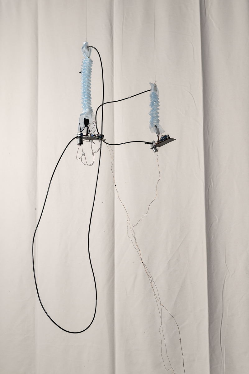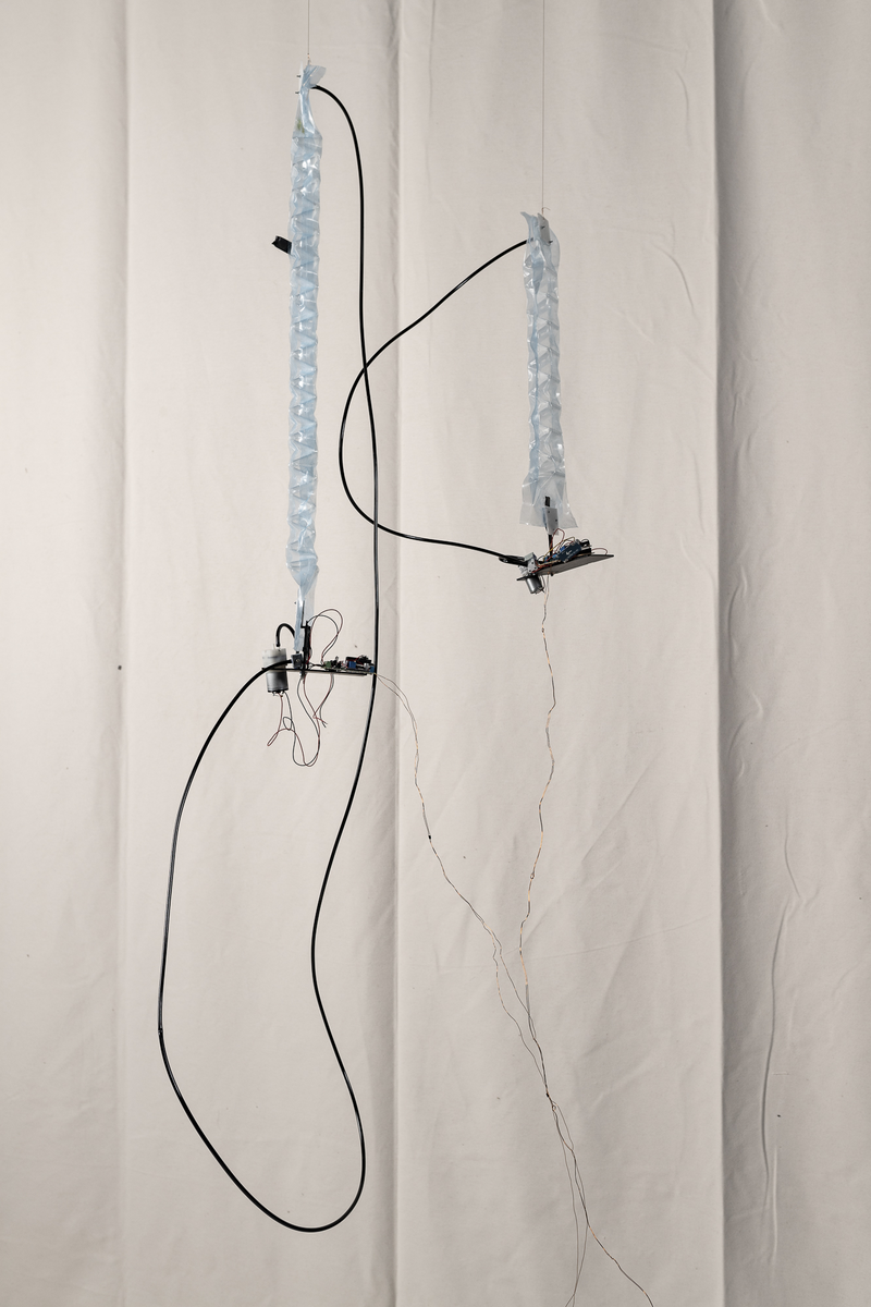 Each of these figures consists of an elongated transparent "plastic bag" with a spine-like structure inside. The spine structure's zigzag shape is somewhat reminiscent of the bellow of an accordion but much narrower. The internal construction is somewhat reminiscent of the human spine. Below the spine hangs a box containing electronics from which a thin black plastic pipe emerges, falling almost to the floor before making its way up to the top of the "spinebag". The figure is, in fact, nothing more than an actuator. It works by using a small electric vacuum pump and some solenoid valves to pump out the air from the bag surrounding the "spine". Since the spine is made up of rectangular pieces of plastic connected with pivot joints, the spine contracts to shorten the whole structure's length as the air is sucked out of the bag. Both of these figures can contract more than 2/3 of their total length.