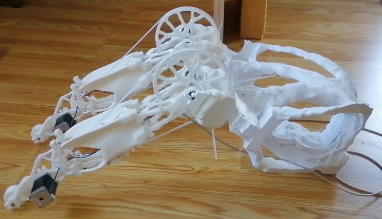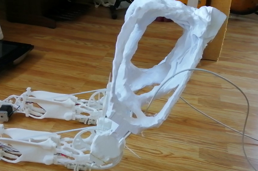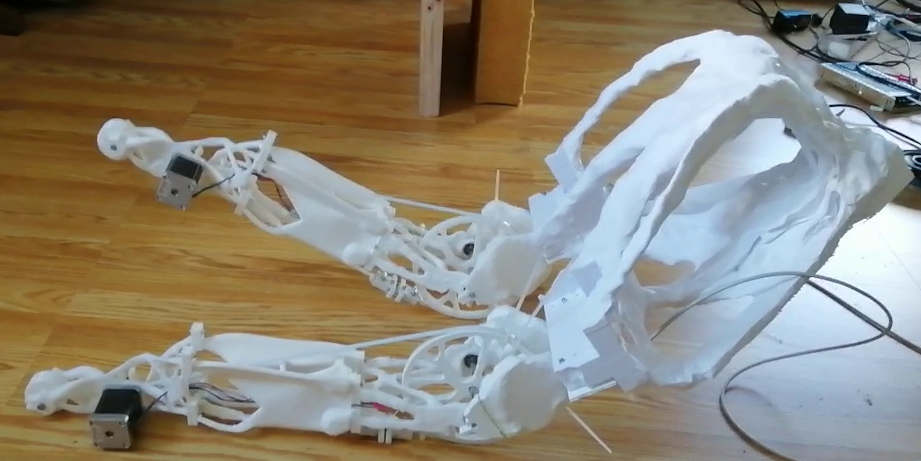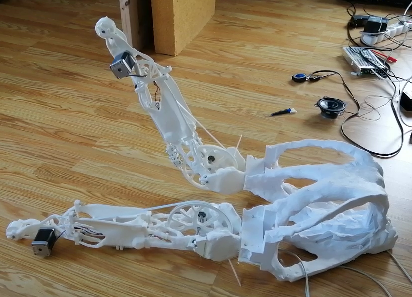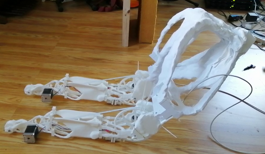 I am readily able to associate this sculpture with the lower part of a primate body, but one oddly lacking flesh and having a very unusual bone structure. This figure follows up #9 and 10 in that it attempts to create mobility through the use of "legs." The limbs are actuated using two large Nema 17 stepper motors turning small pulleys driving a G2 timing belt wrapped around a large pulley rigidly mounted to the figure's trunk at the "pelvis" end. This causes the legs to bend at the base.
