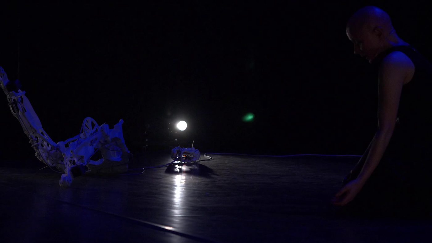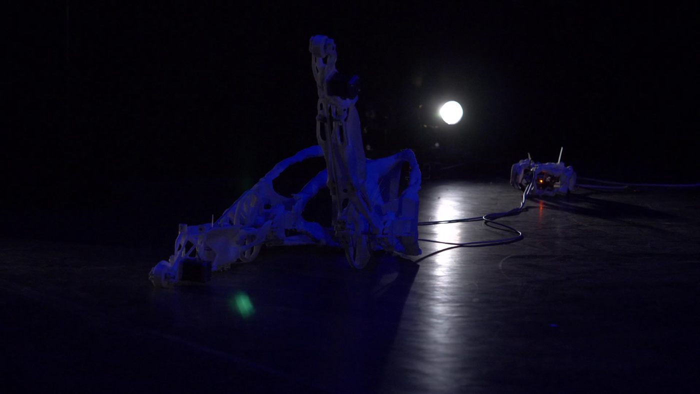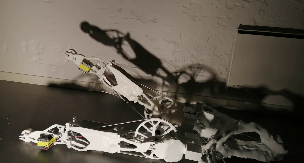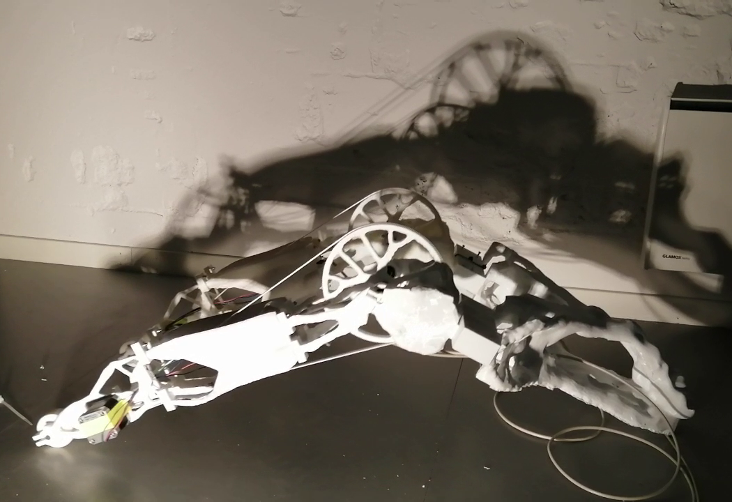 Most of the figure's body is 3D printed in an off-white filament. This gives the texture of the material a bone-like quality. The figure consists of three main parts, with two almost identical structures easily interpreted as limbs attached to a central body that appears somewhat similar to a human pelvis. At the end of each "leg," a small wheel is attached. The wheels utilize one-way needle pin bearings, so they are only able to rotate in one direction.