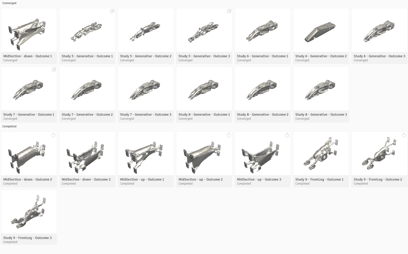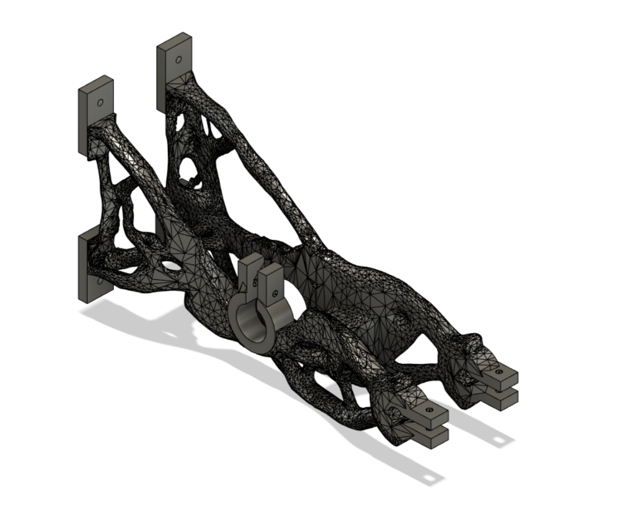 The generative process creates simulations of material joining the load points using genetic design algorithms with cloud-based rendering. The algorithms deliver many different solutions that fulfil the load and structural requirements and leave it to the instigator of the design process, in this case, me, to choose from the selection of solutions. Typically this type of generative design results in shapes that are perceived to be organic looking.x