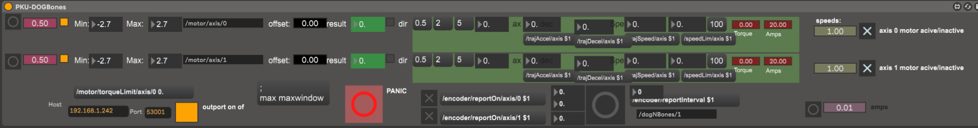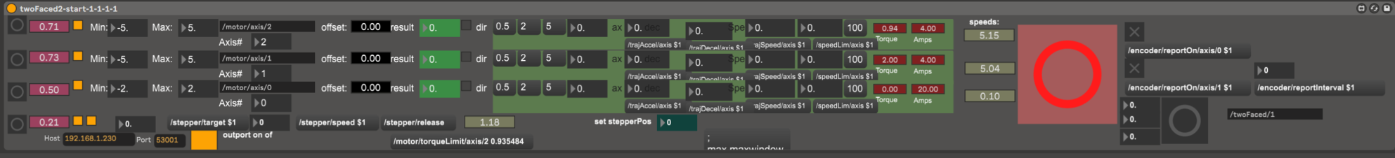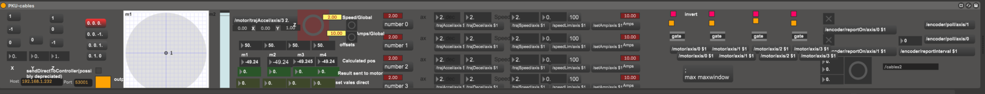 Version two of the control system is run as a set of Max 4 Live patches in Ableton live. The network infrastructure has been simplified by assigning static IP's to all figures. This has made the automatic IP assignment superfluous. The rationale for this was that in productions that are technically demanding, such as the ones in this project, and managing the technical aspects myself, maintaining simplicity is paramount. Since the communication protocol controlling the figures is relatively minimal, it is quite possible to create matching Max 4 Live patches to communicate with each figure. The choice to redesign the control system came from a sense of V1 being unnecessarily complex. Using Ableton Live allows the entire show control system to run in one software package. Besides, the non-linear nature of Ableton's Session view facilitates quick experimentation with movement material in the various figures. The downside is that it has limited support for surround sound production and processing(though possible). I have therefore created a set of multichannel sound file players to run in Ableton Live. I can create audio material alongside movement material by synchronizing Ableton Live and Reaper during development using time code to use Reapers superior surround sound capabilities.