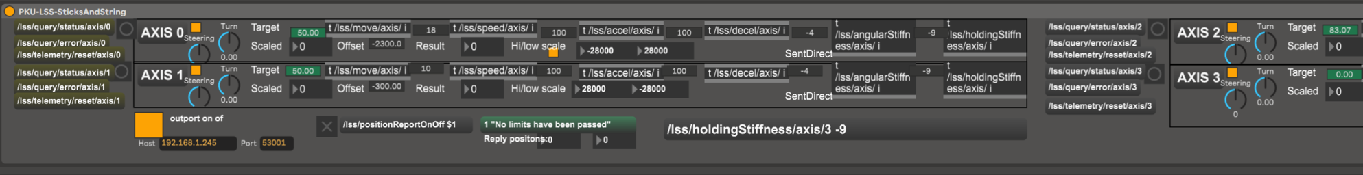 The first version of the control system used Reaper as the primary tool for organizing movement and other materials in time. Reaper has an OSC system implemented but it does not offer the opportunity to freely create custom OSC strings. It was necessary to develop a translation software, implemented in Max/Msp, to translate the OSC output from Reaper and scale the 0 – 1 values from Reaper to OSC commands the figures would respond to.
