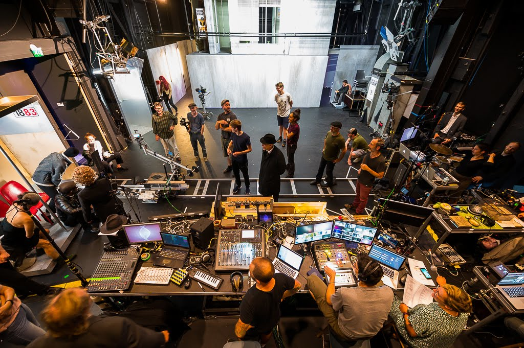 In the performance, the audience is divided into two groups, each experiencing events from two different perspectives. As one group in the theatre space watches the live filming of Underground as a stage piece, the second group in the cinema experiences it as a film, shot, edited and relayed live. All the technicians, actors, camera operators, foley artists and musicians are on the stage. The set design is a mixture of small-scale, modular set components, full-size rooms and environments and all the equipment needed to make a movie: travelling crane, jib, cameras, tripod, microphones, wireless systems etc.
