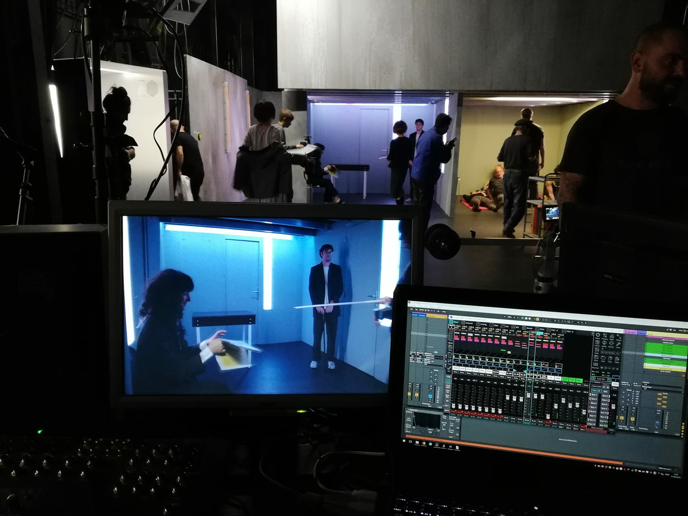 The audience members in the two groups are watching the same actions unfolding. One group experiences it as a coherent narrative structure employing many cinematic conventions to create an engrossing cinematic experience. The other group sees an overview but a somewhat chaotic one, they have an overview but loose coherence. They see many people working precisely together, but in the theatre space, it is about how the actions performed can lead to what is seen on screen. A fundamental premise for all filmmaking is limiting the field of vision through framing to regulate perceptions of a given thing or situation, but this process is usually hidden. It is everything that is not shown that facilitates coherence.