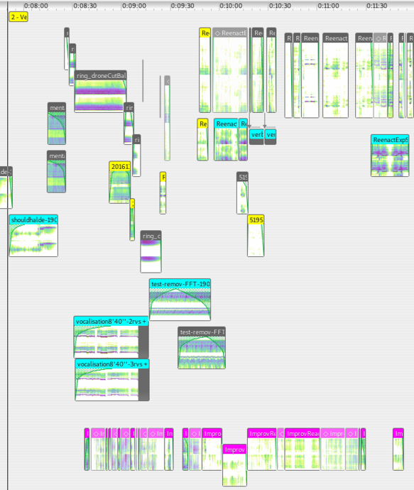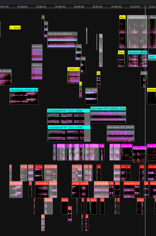 Timeline view after running the silent/non-silent segmentation on the reconstructed four layers of output from “Step Around”. A glue program in SoundProcesses' Control abstraction runs the FScape analysis, and pastes the different audio chunks, coloured red in the bottom section of the screenshot, back onto the timeline. I have already started editing the results, as the light gray tinted boxes (muted) indicate. When I work in the nights, I tend to use the dark skin for Mellite, where the background is dark gray, and the sonogram overviews of the audio regions are of a bright-on-dark palette.