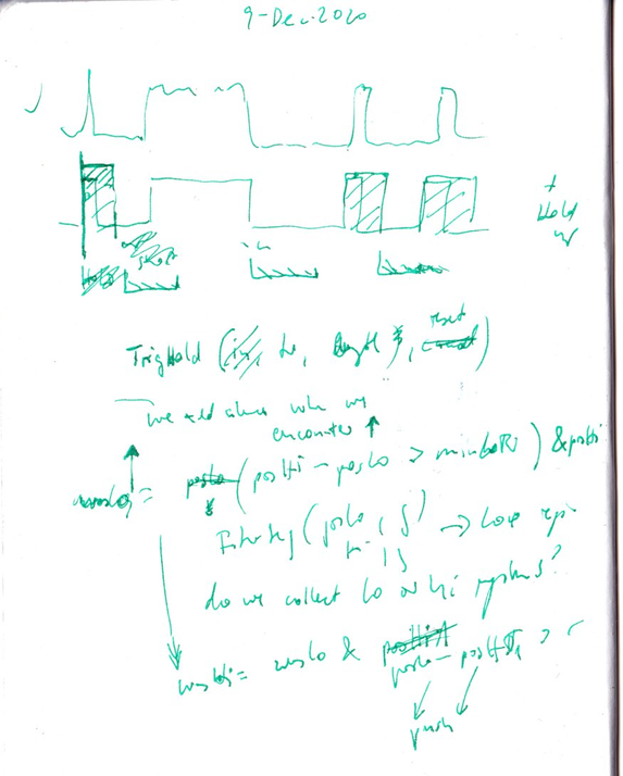 Like so often, a simple UGen was missing that would make this anything but a convoluted translation. I sketched out on paper that a block would be useful that keeps a gate or trigger signal “high” for a period of time. I call this new UGen TrigHold, even though I have moved away from “trigger” signals altogether in favour of “gate” signals; they can be used to trigger something at sample level precision, whereas a trigger can only occur every two sample frames.