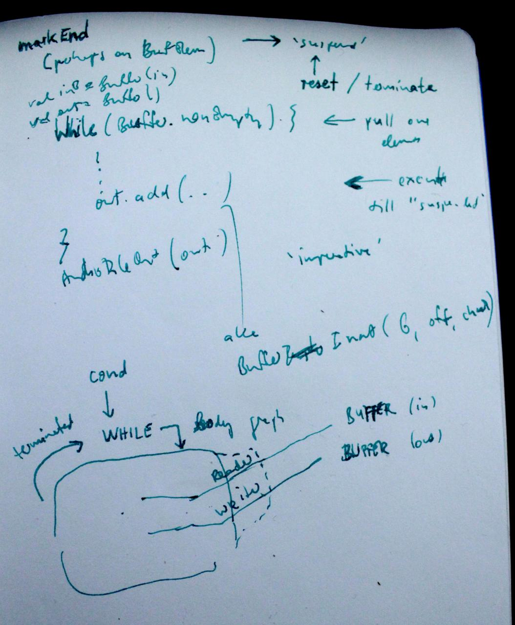 On the right, that's how I sometimes sketch a small algorithm that I want to employ for a sound. This is from an ongoing electroacoustic composition Shouldhalde, and I have a section of one of its parts that I'm not happy with—the sound is still a quite raw microphone recording, you hear the acoustics of the studio, it produces the “wrong space” so to speak. I bounced the 8 minute section, and the idea is to reorder all the sound particles in it, in a variant of what in classic FScape is the StepBack module. That module does a segmentation of a sound, based on local minima in autocorrelation, and then reorders the segments in reverse order. What was developed in the sketch, can be easily formulated in language: Go through the sound. There is a minimum segment length, below which no cutting is down. After the minimum length has been reached, start cross-correlating the sound with “the remaining chunk” of the sound, stopping after a given maximum duration. Determine the local maximum of the cross-correlation; cut the sound here, and proceed by jumping to the correlation partner. “Remove” the parts of the sound which have been “used” so far, and repeat. That's a simple description, but difficult to formulate with the given UGen infrastructure. It requires structured data; for example, one has to maintain a list of regions of the sound that until now have not yet been used. After each step, the used region must be “removed” from that list. And we need random access to the sound. I could implement the whole algorithm as one new UGen. But that goes against the idea UGens as smaller reusable atoms instead of more complex compound algorithms.