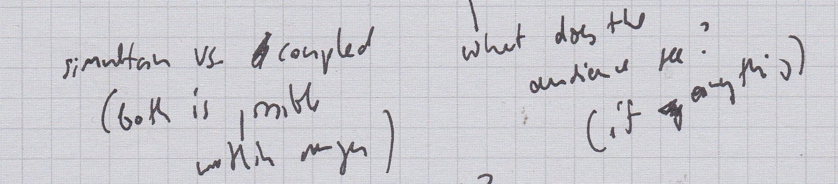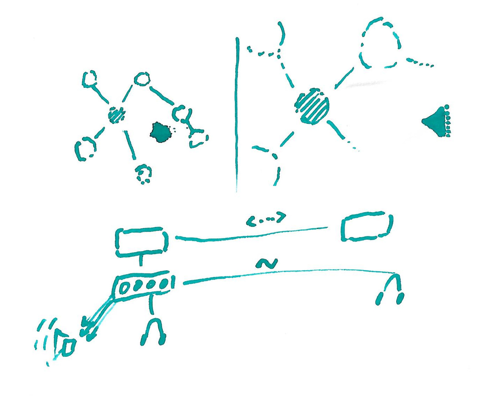 In my improvisation practice, usually each player employs their own self-developed instrument, and I have come to appreciate this heterogeneity. Often the systems/instruments are wired together, cross-feeding audio signals that allow complex feedback and mutual influence. On the other hand, this approach is limiting, and I am interested in exploring how playing together “in the same virtual space” could work, if it is not understand as a form of being “synchronously” engaged in a causal relation that produces a “unified" piece.