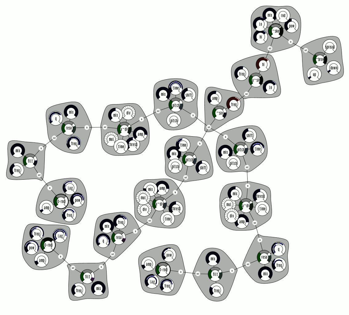 Since this approach is not unlike patching in a system like PD, if you imagine that you bring up prior written abstractions, and since many things can be done via keyboard control and text input, Wolkenpumpe could be called a live coding'ish system. But then, does the audience become a viewer? Do they visually see what is happening? I rarely project the screen, although many people find it visually pleasing, and it certainly has its distinct aesthetic quality. Sometimes I sit in a space, and people can walk around, and they usually notice the interface, they look over my shoulder, and after the concert I get questions about Wolkenpumpe, and how to interpret the moving amoebas. I somehow find that nicer than forcing the visual channel on the audience. Since the visual interface is fully independent of the sound synthesis layer, it would also be possible to develop a second view only for the audience that is less technical and more abstract / poetic?