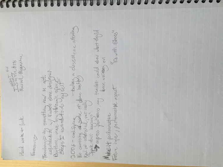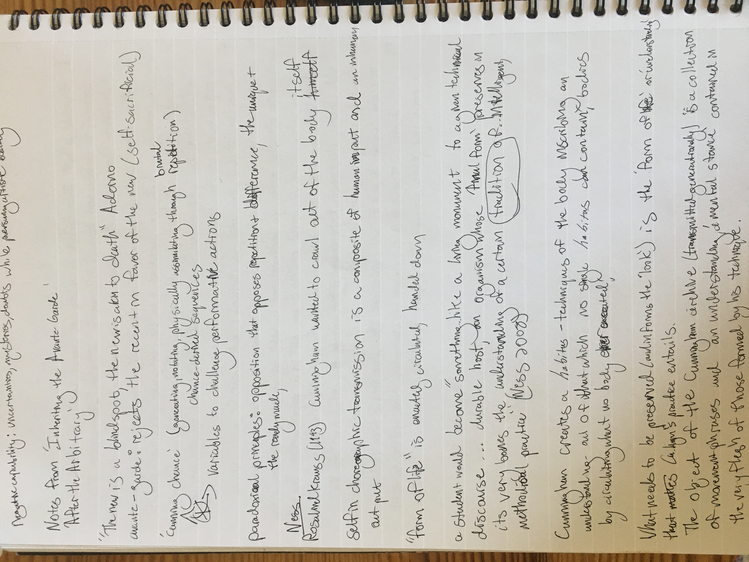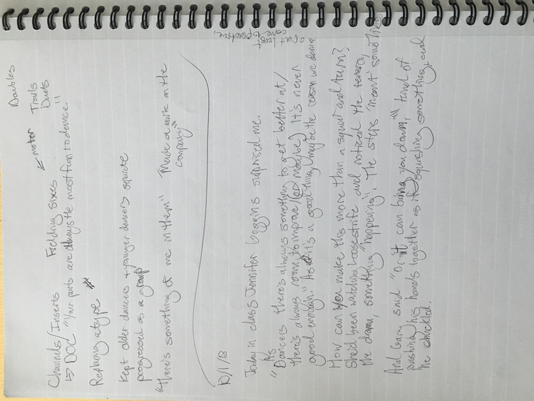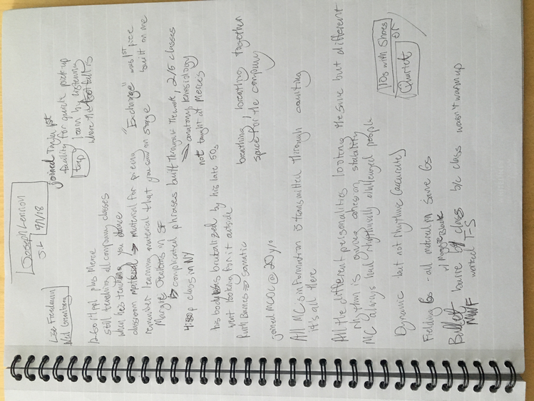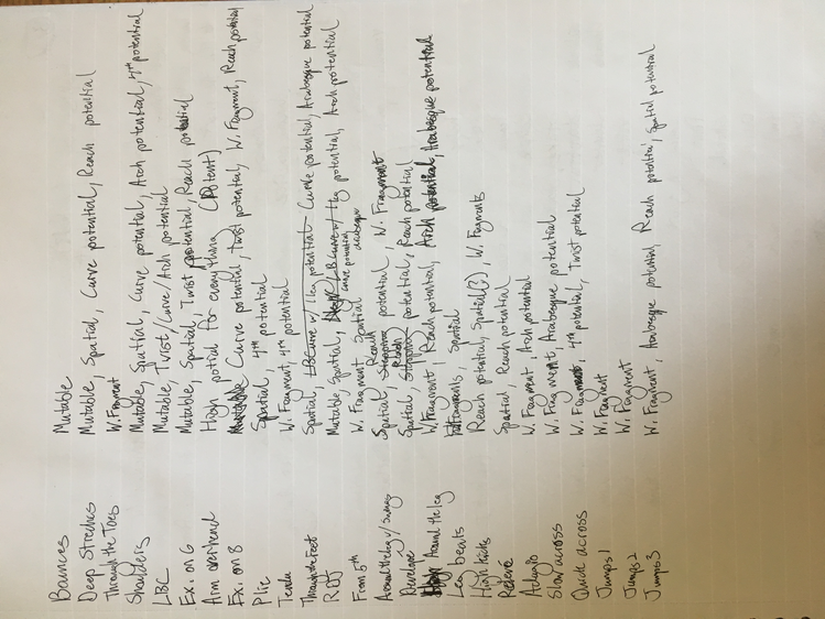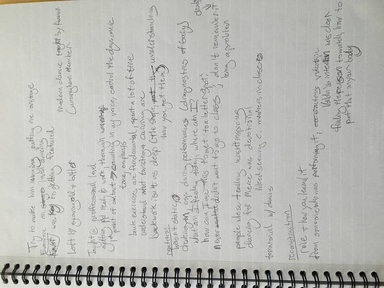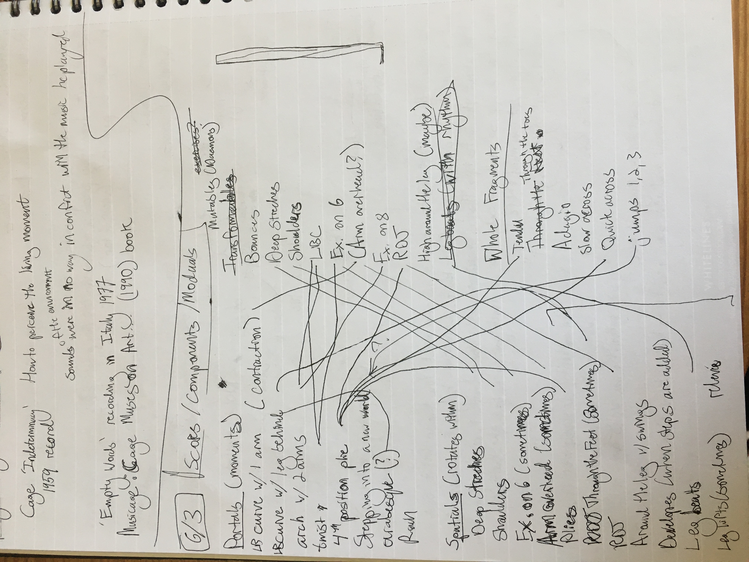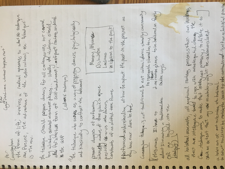 These texts are an invitation to offer insight into this poetic and personal practice developed during the course of my study. Through a regular and ongoing studio practice I draw on my personal dance history as material in an attempt to understand the affective and performative aspects of devotion in dancing, the very devotion which both obscures and reveals something intimate, but beyond the subjective. Recalling and amplifying the ghostly present and presences in a film recording of a single Cunningham technique class, I have been exploring the spectral remains in the transmission of a dance technique, from recording of living bodies to a digital, publicly-available video and then to my corporeal reinterpretation of that video. By continuously repeating the same material over the course of nearly two years I have developed a multilayered understanding of the material, which allows me to depart from and return to the class through associative portals. I bilocate between the physical site of practice and the space of recall, between an action from the class and the memory of that action. I enjoy the strange spectral things that arise from this practice: ghosts, portals, other bodies. With my eyes closed, my attention is displaced from image to sensation. It’s about work. “Not to show off, but to show,” as Cunningham said. It’s about toil. It’s about devotion. These slippery materials propose to invert the traditional choreographic relationship to presence, and instead call upon memory, absence, and dislocation to provide an understanding of movement through time and space. This collection is comprised of texts written at various points throughout my two years in the MA program New Performative Practices (NPP) at Stockholm University of the Arts. My focus on devotion in Cunningham technique originated as a self-organized Advanced Independent Study. This course was built on readings, a solo studio practice, teaching others, and interviews with former Merce Cunningham Dance Company members. I created exposition on the Research Catalogue as part of my exam, a precursor to this one. In creating the exposition, my notebook became a central tool, a material I carried and used everywhere, from the studio to the classroom to interviews to the library, all places where I carried out the study. I wrote texts on top of photographs of my notes, and the presence of two texts situated together suggests dynamic reading possibilities. This MA is research-preparatory and strictly speaking this is not artistic research. I’ve taken advantage of the liberty being independent of formal academic research offers. The traditional citation models, academic formatting, and impartial address have been left behind at times to favor for a looser, more experimental formatting, multiple styles of essays, and a piece-meal approach to continuity. Thanks to: Anna Giertz for design and layout of the print version, which inspired this version; Chrysa Parkinson, Litó Walkey, Jeanine Durning for supervision; Frank Bock for portals; Martin Hargreaves for unpacking performativity; Rebecca Hilton for the initial push; my NPP colleagues for their feedback, curiosity, and support; Ken Tabachnick for insight from the Merce Cunningham Trust; Patricia Lent, Andrea Weber, Joseph Lennon, and Michael Cole for interviews; Sarah Michelson for devotion; Moriah Evans for searching for forms; Kris Berggren for the ordinary devotion which got me here, and copy editing; Pat Richter for her music; Robert Swinston for class, again and again.