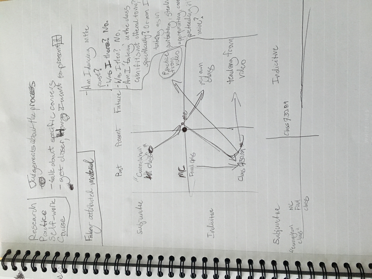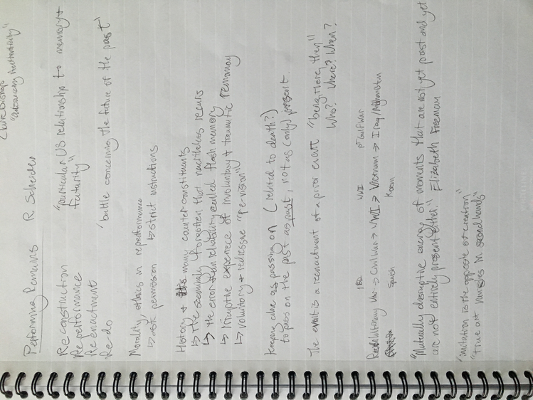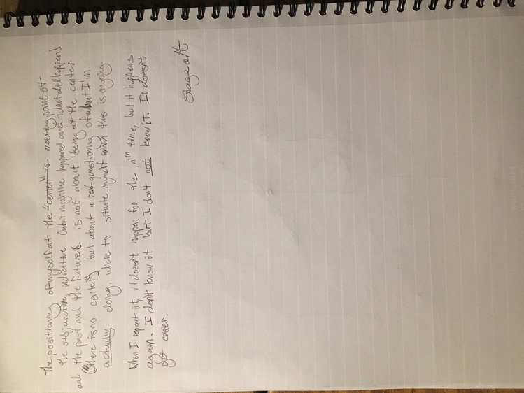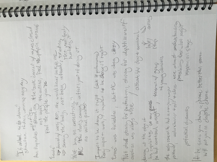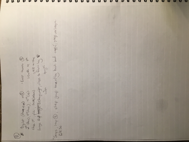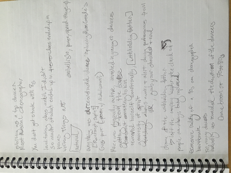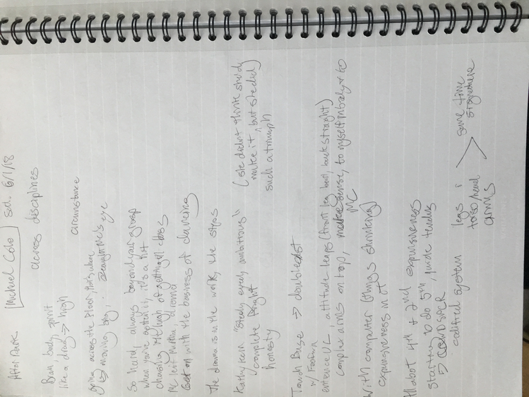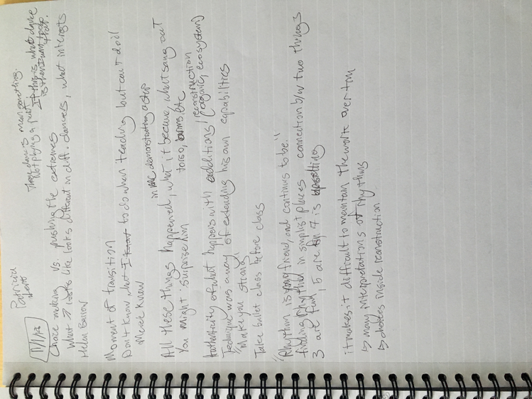 These texts are an invitation to offer insight into this poetic and personal practice developed during the course of my study. Through a regular and ongoing studio practice I draw on my personal dance history as material in an attempt to understand the affective and performative aspects of devotion in dancing, the very devotion which both obscures and reveals something intimate, but beyond the subjective. Recalling and amplifying the ghostly present and presences in a film recording of a single Cunningham technique class, I have been exploring the spectral remains in the transmission of a dance technique, from recording of living bodies to a digital, publicly-available video and then to my corporeal reinterpretation of that video. By continuously repeating the same material over the course of nearly two years I have developed a multilayered understanding of the material, which allows me to depart from and return to the class through associative portals. I bilocate between the physical site of practice and the space of recall, between an action from the class and the memory of that action. I enjoy the strange spectral things that arise from this practice: ghosts, portals, other bodies. With my eyes closed, my attention is displaced from image to sensation. It’s about work. “Not to show off, but to show,” as Cunningham said. It’s about toil. It’s about devotion. These slippery materials propose to invert the traditional choreographic relationship to presence, and instead call upon memory, absence, and dislocation to provide an understanding of movement through time and space. This collection is comprised of texts written at various points throughout my two years in the MA program New Performative Practices (NPP) at Stockholm University of the Arts. My focus on devotion in Cunningham technique originated as a self-organized Advanced Independent Study. This course was built on readings, a solo studio practice, teaching others, and interviews with former Merce Cunningham Dance Company members. I created exposition on the Research Catalogue as part of my exam, a precursor to this one. In creating the exposition, my notebook became a central tool, a material I carried and used everywhere, from the studio to the classroom to interviews to the library, all places where I carried out the study. I wrote texts on top of photographs of my notes, and the presence of two texts situated together suggests dynamic reading possibilities. This MA is research-preparatory and strictly speaking this is not artistic research. I’ve taken advantage of the liberty being independent of formal academic research offers. The traditional citation models, academic formatting, and impartial address have been left behind at times to favor for a looser, more experimental formatting, multiple styles of essays, and a piece-meal approach to continuity. Thanks to: Anna Giertz for design and layout of the print version, which inspired this version; Chrysa Parkinson, Litó Walkey, Jeanine Durning for supervision; Frank Bock for portals; Martin Hargreaves for unpacking performativity; Rebecca Hilton for the initial push; my NPP colleagues for their feedback, curiosity, and support; Ken Tabachnick for insight from the Merce Cunningham Trust; Patricia Lent, Andrea Weber, Joseph Lennon, and Michael Cole for interviews; Sarah Michelson for devotion; Moriah Evans for searching for forms; Kris Berggren for the ordinary devotion which got me here, and copy editing; Pat Richter for her music; Robert Swinston for class, again and again.