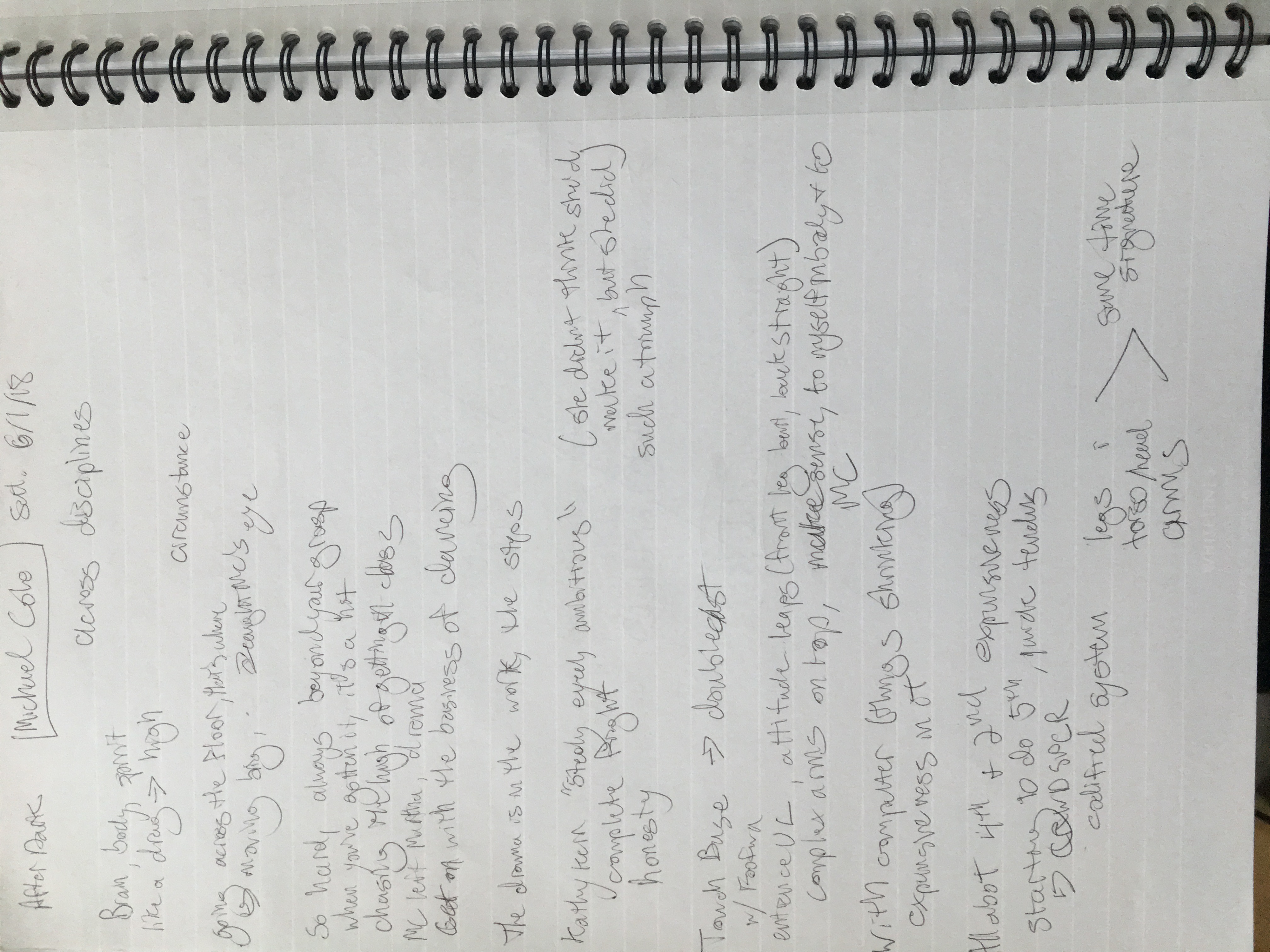 That worked for Michael Cole. Michael caught Merce's eye in class. In the 1980s Merce’s classes (and his dances) were full of large second and fourth positions, with tilts and big curves of the spine. This kind of expansive dancing, where positions are pushed to the edges of the body and then a little bit further is something that I find so exciting in class. In performance, adrenaline can push you to move bigger, quicker, higher, but to actively practice moving beyond the dimensions of the body in class is folded into the aims of the technique itself. Of course, this style of moving bigger might have served as a way to capture Merce's attention in class, in the structure of the school as a recruiting ground, it became a part of the vernacular and style of Cunningham technique. Michael described the high of dancing in exercises which moved through space and across the studio. He told me that Cunningham technique class was “always beyond your grasp” but then "when you've gotten it, it's a hit." Like a drug habit, the high was elusive.