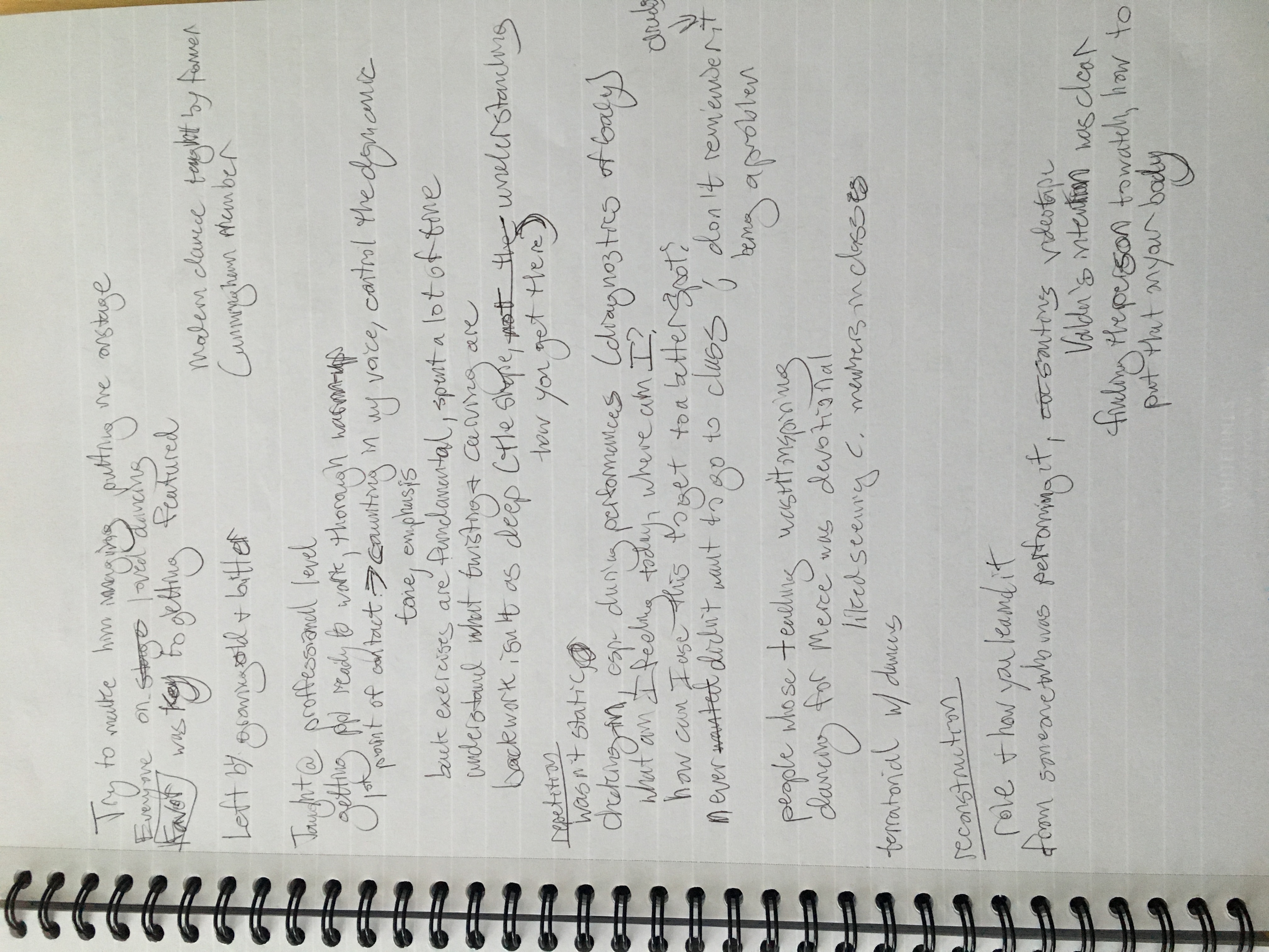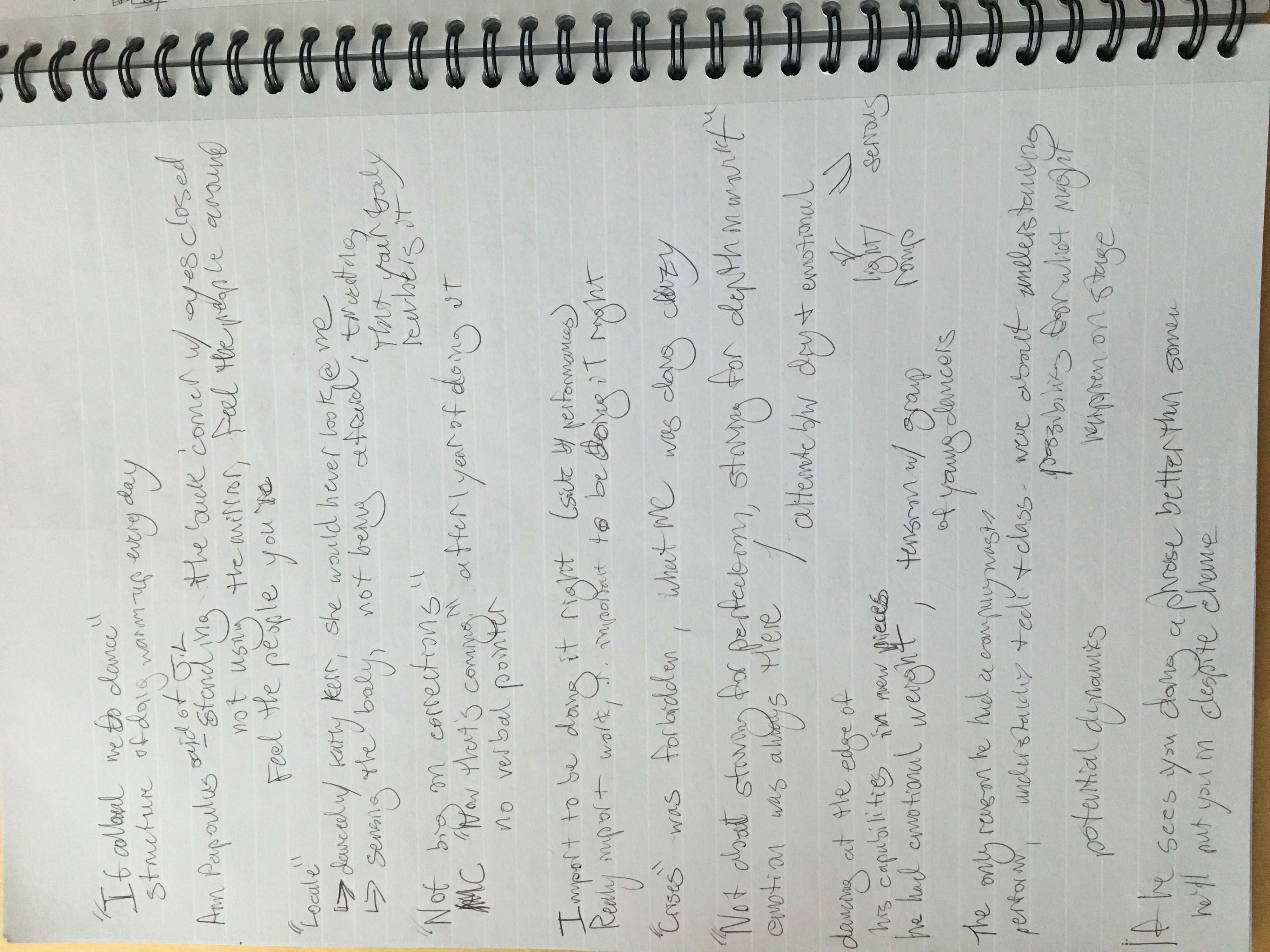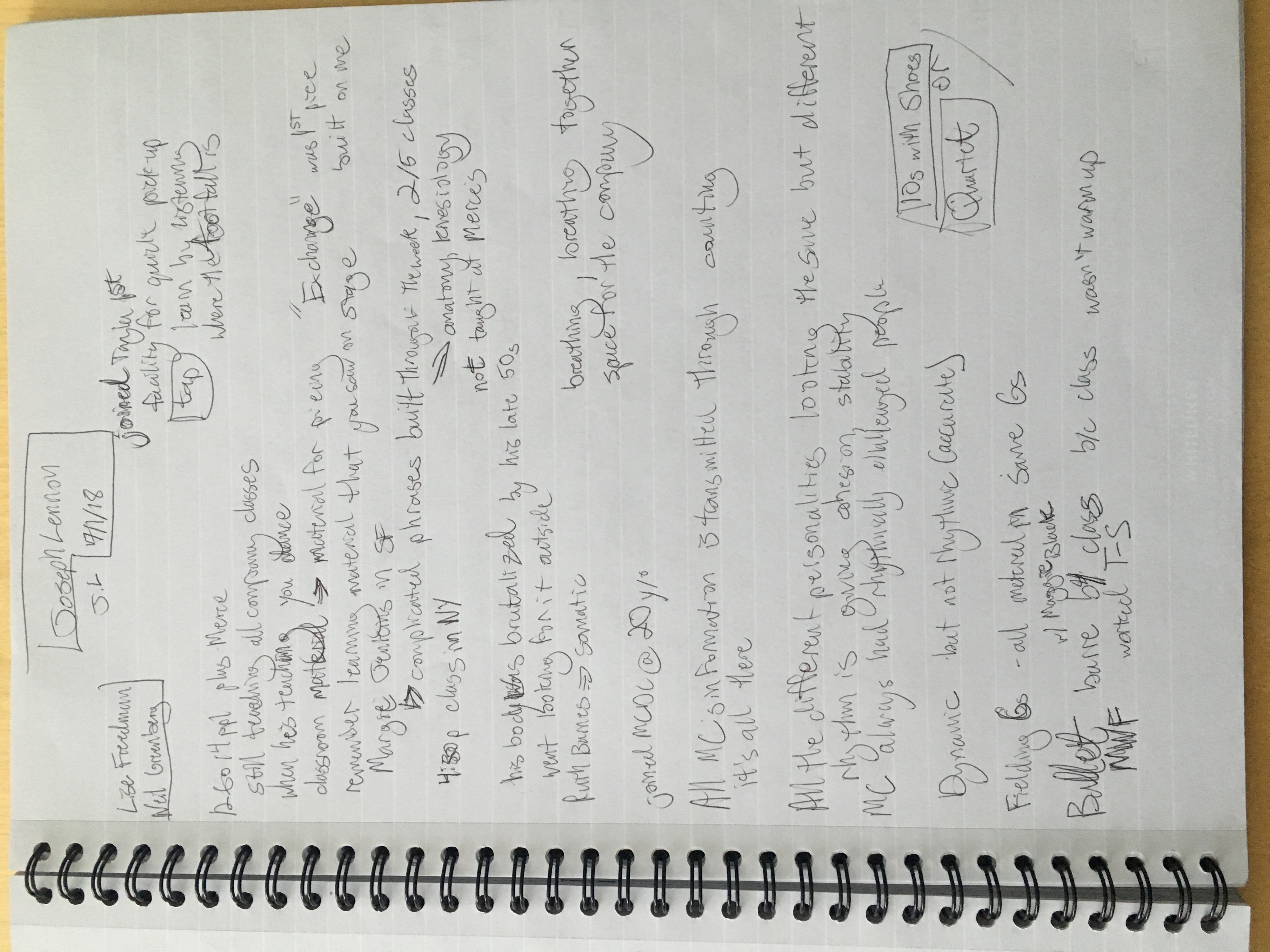 “How can I use this to get to a better spot?” was a statement of Joseph’s I wrote down. I’m not sure if he was talking about improving his position in the eyes of Merce or about how to use class to get deeper access to his body’s capabilities.