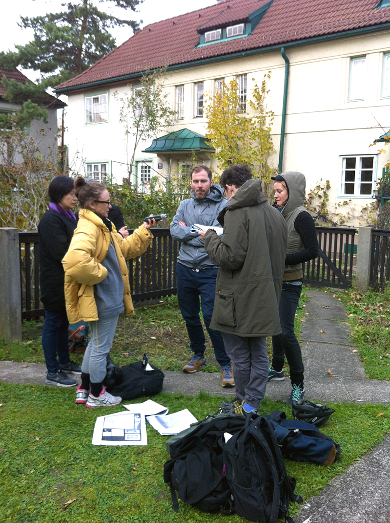 Spaces of Commoning research group, collective walk and reading, Rosenhügel settlement, Vienna, 2014