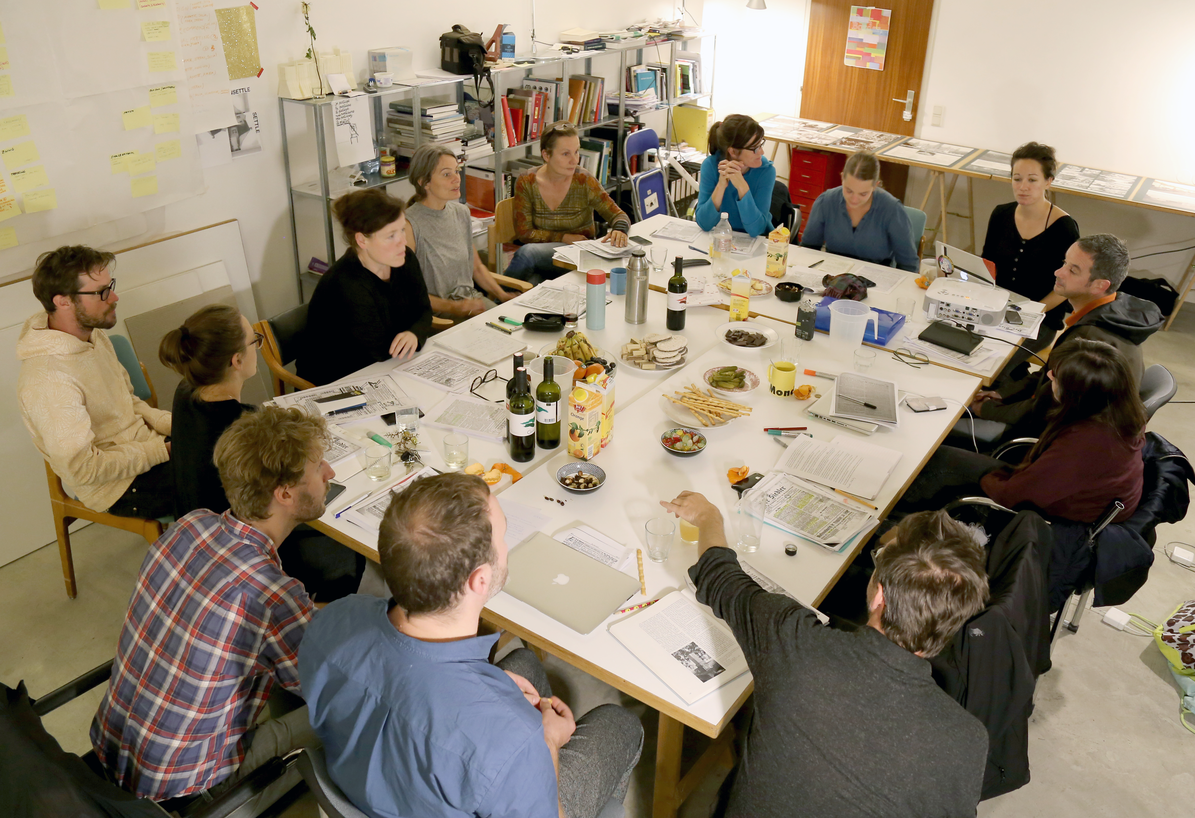 Intrigued by the ambivalence of the newspaper’s role, we set out to revisit the creation of the newspaper by organising an editorial meeting nearly one hundred years after its original publication. We invited a group of organisers, activists and researchers from Vienna to take on the role of guest editors and collectively read, review and critique Der Siedler’s first issue, and consequently imagine what questions a new edition might address today. The guest editors were selected for their engagement with the settlers’ movement through research or for their involvement and activism in projects and practices surrounding self-organisation, cooperatives or commoning in the city. Andreas Gautsch, Ernst Gruber, Michael Klein, Peter Krobath, Karin Lischke, Maria Mesner, Tina Wintersteiger and the members of the Spaces of Commoning research group all gathered in our office for an editorial meeting.