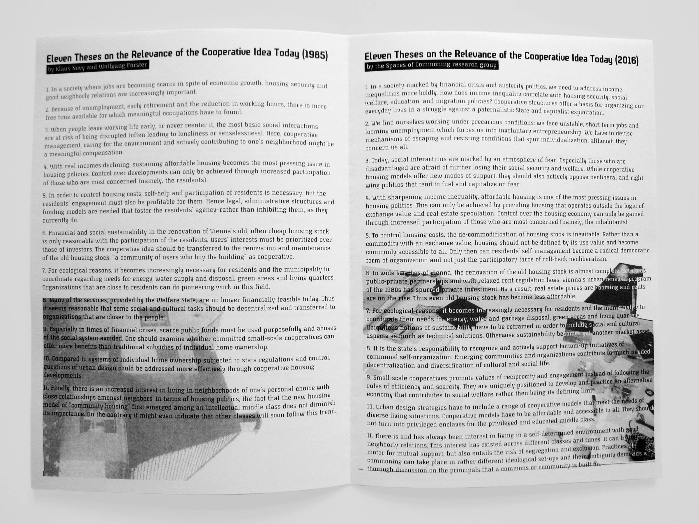 One of our central sources at the Rosenhügel was Einfach Bauen, a seminal book edited by Novy and Förster in 19856, which also accompanied a travelling exhibition Novy curated together with Günther Uhlig. By revisiting ideas of cooperative and self-organised housing, their comprehensive documentation contributed to a broader debate on prevalent economic crises of the 1980s and the early disintegration of the welfare state. One chapter is dedicated to eleven theses on what we can learn from the settlers’ cooperative ideas today (being 1985). Novy and Förster’s attempts at writing and rewriting history render palpable the extent to which their thoughts and positions are embedded in a specific moment in time. They inspired us to reframe the settlers’ ideas from today’s perspective by rewriting the eleven theses.