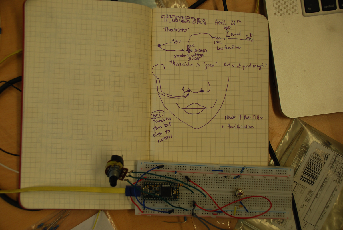 Prototyping a respiration sensor using a thermistor placed just below the nostril. The thermistor is a type of resistor whose resistance is dependent on temperature. If placed close to nostril, the temperature differences caused by breathing can be used to calculate various respiration features.