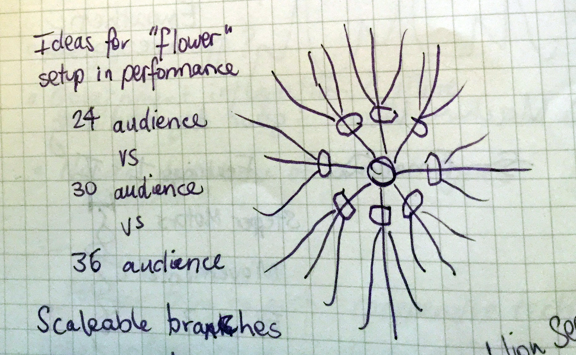 Yeah, that could be interesting. I think it would make people less nervous, because it becomes more distributed evenly and maybe you would forget about your sensor a bit more if it wasn’t so in your face. Because if you have your whole body rigged up with sensors, I couldn’t see how people would feel comfortable in the room or be capable of relaxing. Cause it would be like: oh, I hope I don’t sit on this 20 dollar thing. Whereas if you just have one thing to take care of, it’s like a lot more manageable as an audience member. I mean, I think it has to be part of it. If I really strap you in and turn you into a little cyborg for the night, then it could be part of it. Some people fetishize this kind of ‘I am a robot’ thing. But I don’t know, I’m also just thinking that that wouldn’t last so long and after 10 minutes you just want to get out of your sweaty sensor.