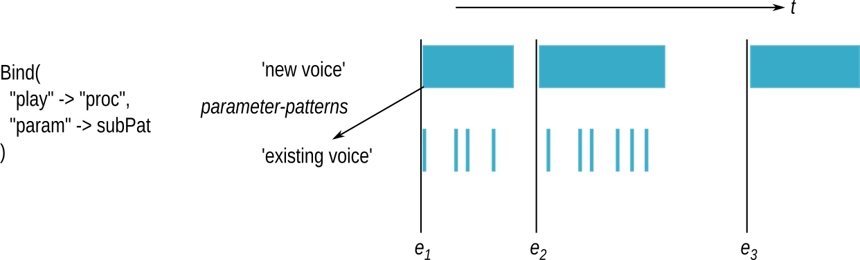 Without a 'set' type event, we could imagine that the background-updates are actually auxiliary patterns to a main pattern; that is to say, a parameter in the main bind is specified as a (nested) pattern itself.
