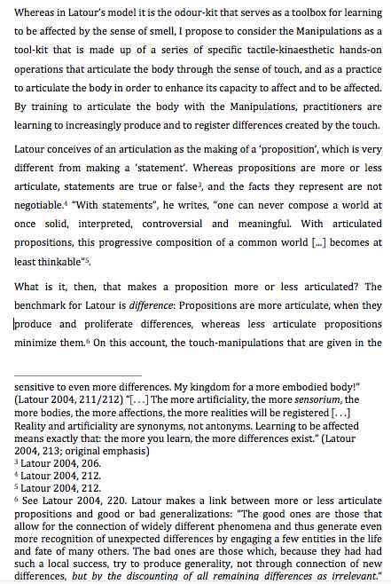To sum up, following Latour, I propose considering the Manipulations to be a practice for learning how to articulate bodies in order to enhance their affectability, and to produce difference. To this effect, learning to be affected by differences is a relational and generative process: a body does not precede its capacity to be affected, but it comes into being, in the first place, by articulating relations to itself and to other (non-)human bodies, and by multiplying its differences. Thus, becoming a body9 is a matter of learning how to articulate, and to be affected by, differences. Following this, I suggest conceiving of the Manipulations as a relational practice of articulating the body’s becoming.
