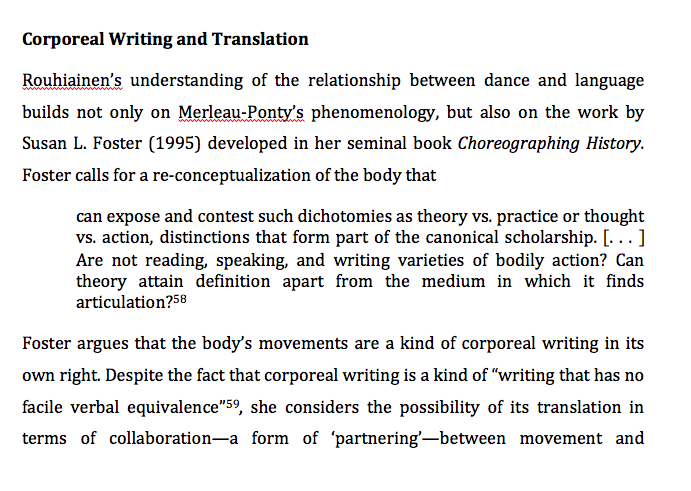 Rouhiainen’s understanding of the relationship between dance and language builds not only on Merleau-Ponty’s phenomenology, but also on the work developed by Susan L. Foster (1995) in her seminal book Choreographing History. Foster calls for a re-conceptualization of the body that
