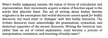 Where bodily endeavors assume the status of forms of articulation and representation, their movements acquire a status of function equal to the words that describe them. The act of writing about bodies thereby originates in the assumption that verbal discourse cannot speak for bodily discourse, but must enter in ‘dialogue’ with that bodily discourse. The written discourse must acknowledge the grammatical, syntactical, and rhetorical capacities of the moved discourse. Writing the historical text, rather than an act of verbal explanation, must become a process of interpretation, translation, and rewriting of bodily texts.60