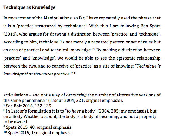 In my account of the Manipulations, so far I have repeatedly referred to them as a practice structured by techniques. With this, I follow, to a certain extent, Ben Spatz (2016), who argues that we should draw a distinction between ‘practice’ and ‘technique’. According to him, technique “is not merely a repeated pattern or set of rules but an area of practical and technical knowledge”.10 By making a distinction between ‘practice’ and ‘knowledge’, Spatz argues, we are able to see the epistemic relationship between the two, and to conceive of ‘practice’ as a site of knowing: “Technique is knowledge that structures practice”.11
