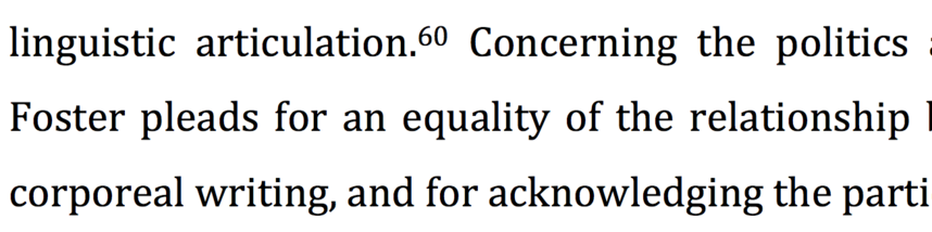 [57] Foster 1995, 12. She further elaborates: “A body, whether sitting writing or standing thinking or walking talking or running screaming, is a bodily writing. Its habits and stances, gestures and demonstrations, every action of its various regions, areas, and parts – all these emerge out of cultural practices, verbal or not, that construct corporeal meaning. Each of the body’s moves, as with all its writings, traces the physical fact of movement and also an array of references to conceptual entities and events. Constructed from endless and repeated encounters with other bodies, each body’s writing maintains a nonnatural relation between its physicality and its referentiality. Each body establishes this relation between physicality and meaning in concert with the physical actions and verbal descriptions of bodies that move alongside it. Not only is this relation between the physical and the conceptual nonnatural, it is also impermanent. It mutates, transforms, reinstantiates with each new encounter.” (Foster 1995, 3)