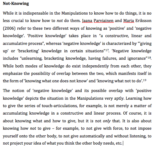 The notion of negative knowledge and its possible overlap with positive knowledge depicts the situation in the Manipulations very aptly. Learning how to give the series of touch-articulations, for example, is not merely a matter of accumulating knowledge in a constructive and linear process. Of course, the question is about knowing what and how to give; but it is not only that. It is also about knowing how not to give – for example, to not give with force, to not impose yourself onto the other body, to not give automatically and without listening, to not project your idea of what you think the other body needs, etc.