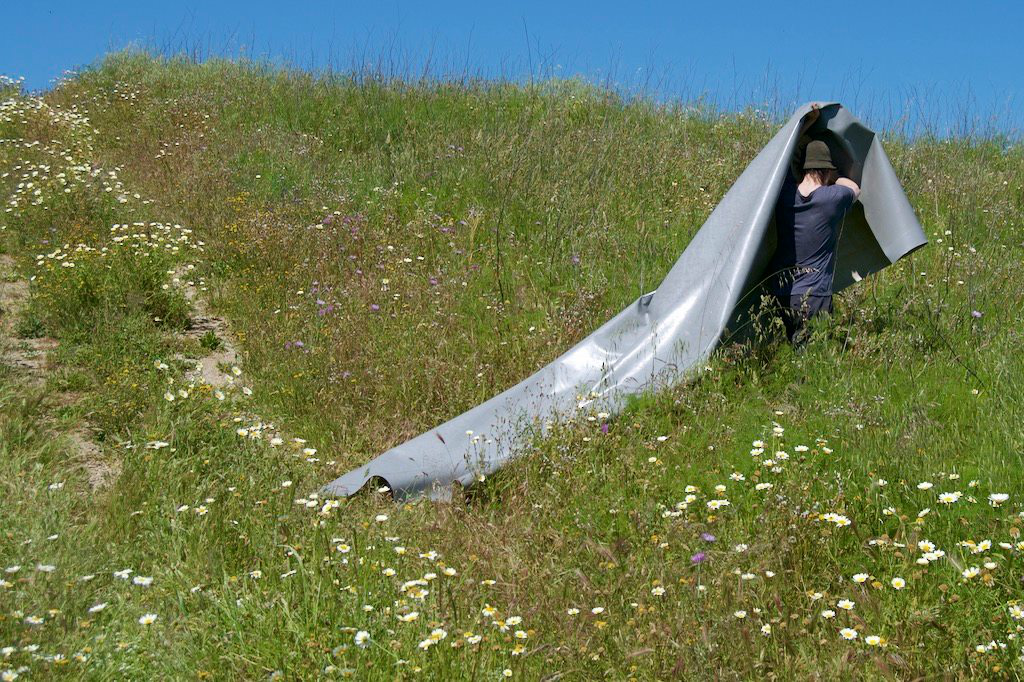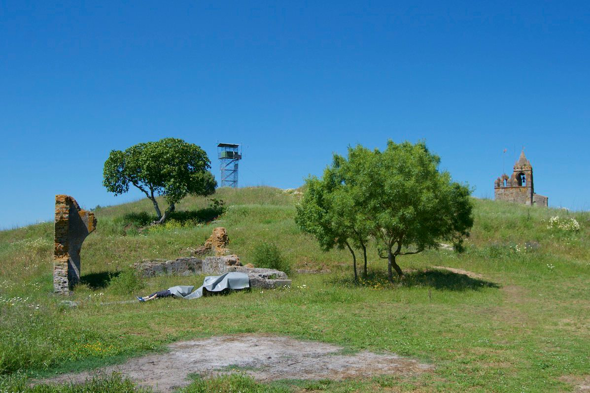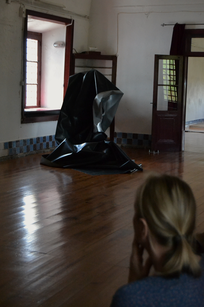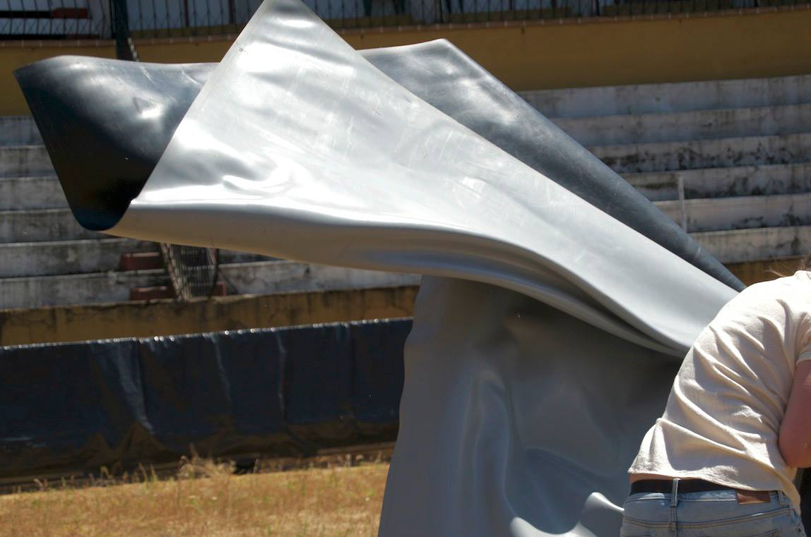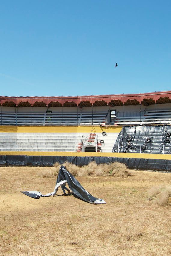 After the first artistic part, the process with the dance mat continued at the O Espaco do Tempo residency in Monte-Mor-o-Novo in Portugal from 17.5–31.5.2016. I continued playing with the mat outside of the studio conditions. By taking the object outdoors, the project took on more environmental emphasis. In the warm, sunny weather, the quality of the dance mat changed; it became liquid, soft, and heavy. After few experiments outdoors, in the area surrounding the residency, I decided to take the mat to the abandoned bullfighting arena, which was close to the residency. There, with the help of my collaborator Vincent Roumagnac, I made the video called A Matfighter.