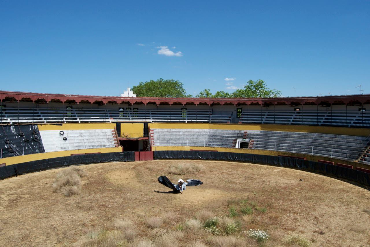 After the first artistic part, the process with the dance mat continued at the O Espaco do Tempo residency in Monte-Mor-o-Novo in Portugal from 17.5–31.5.2016. I continued playing with the mat outside of the studio conditions. By taking the object outdoors, the project took on more environmental emphasis. In the warm, sunny weather, the quality of the dance mat changed; it became liquid, soft, and heavy. After few experiments outdoors, in the area surrounding the residency, I decided to take the mat to the abandoned bullfighting arena, which was close to the residency. There, with the help of my collaborator Vincent Roumagnac, I made the video called A Matfighter