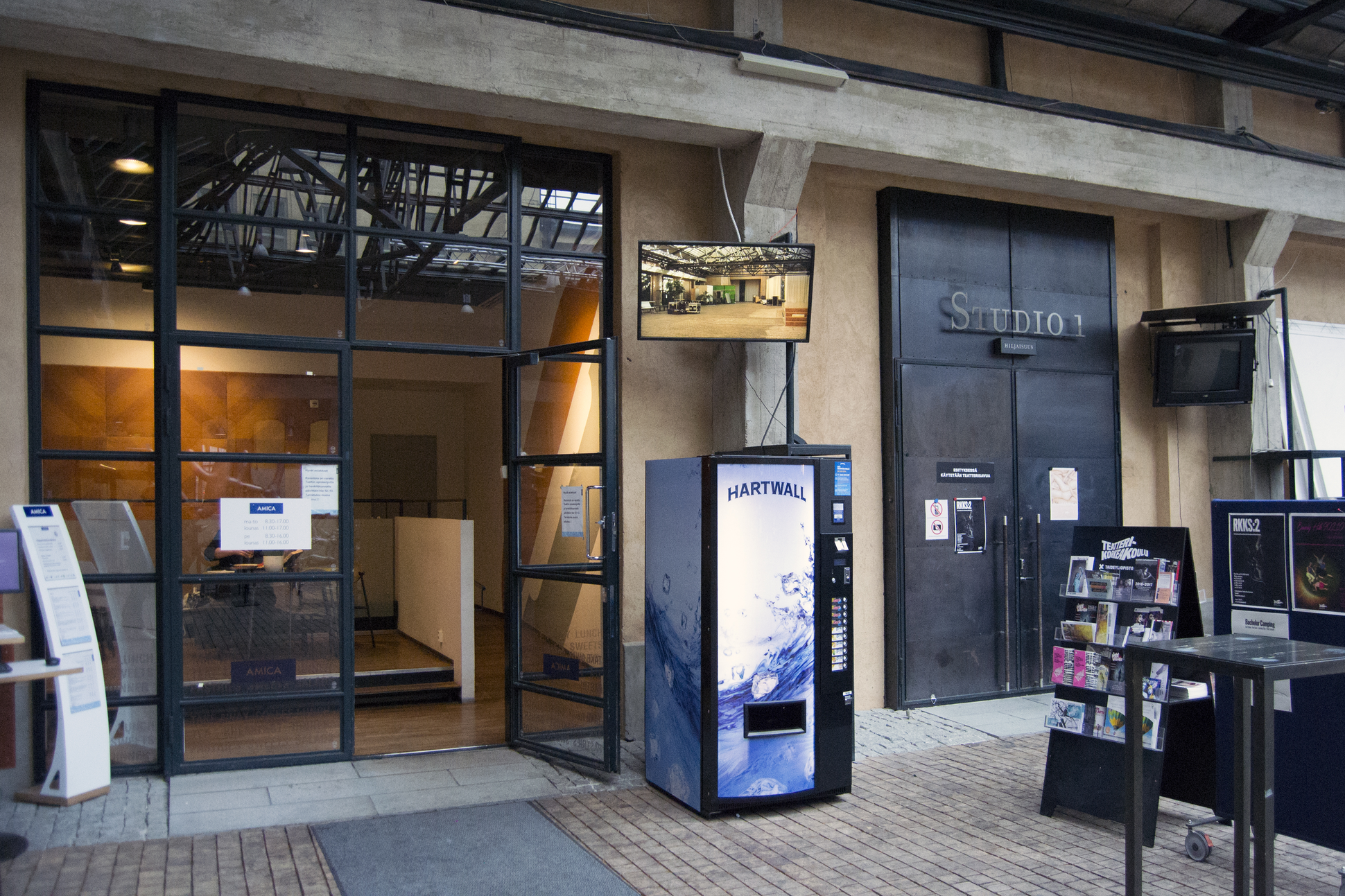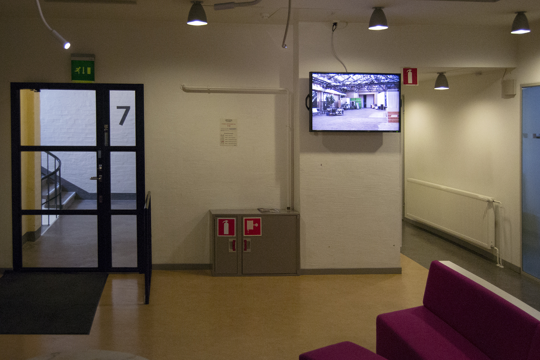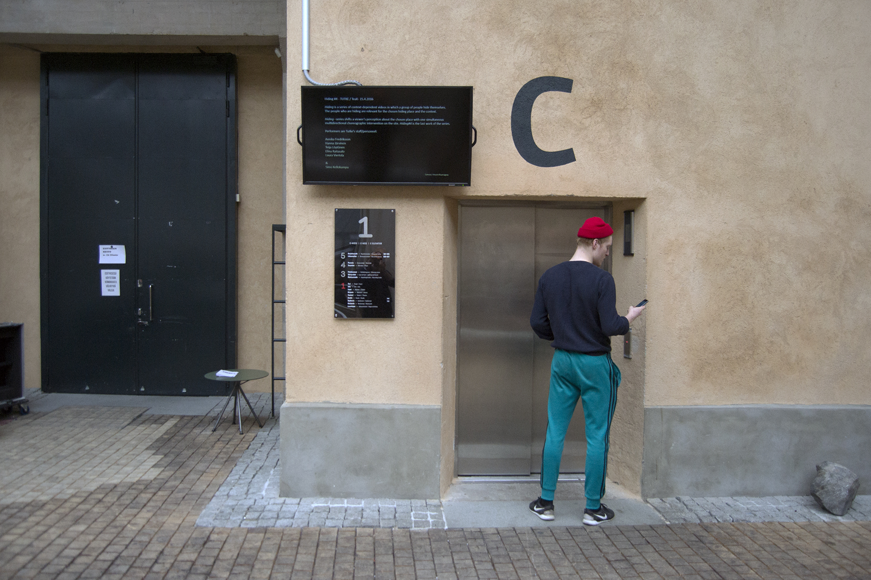 Later, for the first examined artistic part, in 2016, I made a Hiding#4 video at the Theatre Academy with the personnel of the Performing Arts Research Centre. This video was made in the entrance hall of the Theatre Academy. Hiding#4 was displayed on the info-screens situated around the building of the Theatre Academy once per hour on each screen simultaneously. Thus, it took place all over the Theatre Academy, and the project examined and expanded within these parts the contextualization of the work from one point in the working place to many different simultaneous ones.